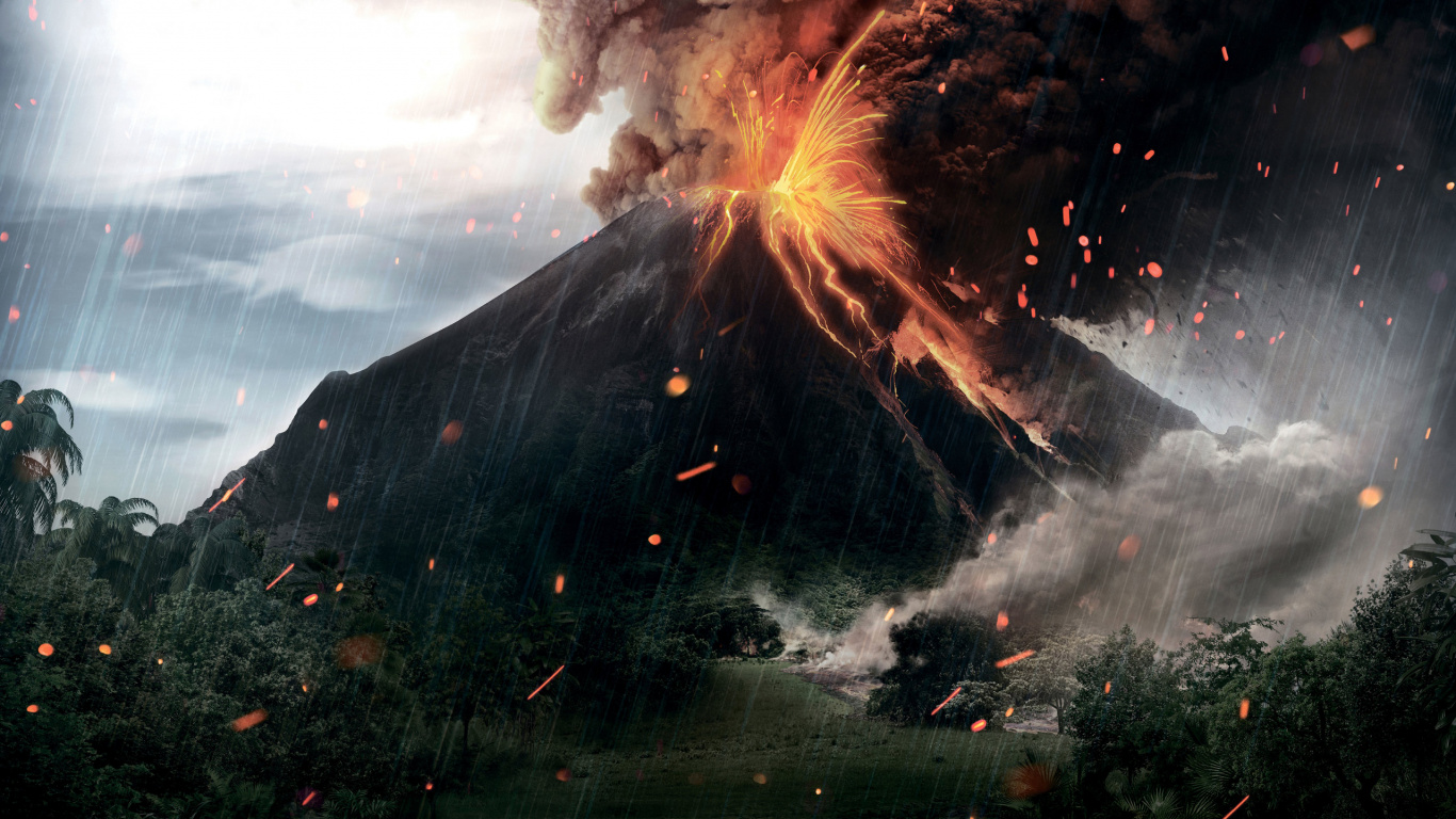 Обои 1366x768 парк юрского периода, пейзаж, дым, гора, Мир Юрского Периода Эволюция, HD ready картинка