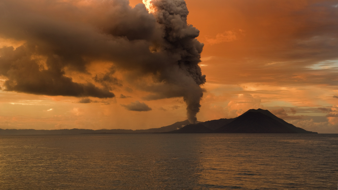 Обои 1366x768 вулкан, стратовулкан, облако, горизонт, море, HD ready картинка