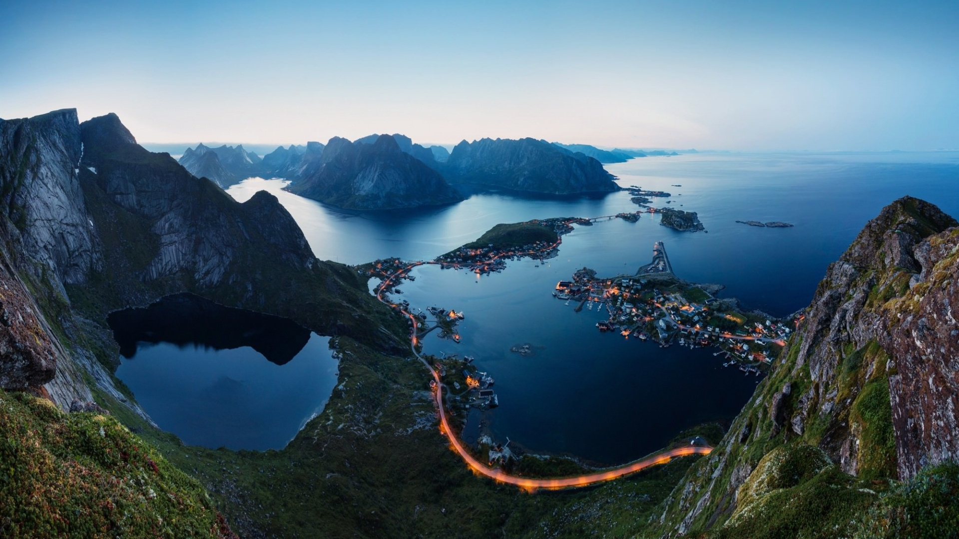 Обои 1920x1080 Лофотен, фьорд, гора, озеро, нагорье, Full HD, HDTV, 1080p 16:9 картинка