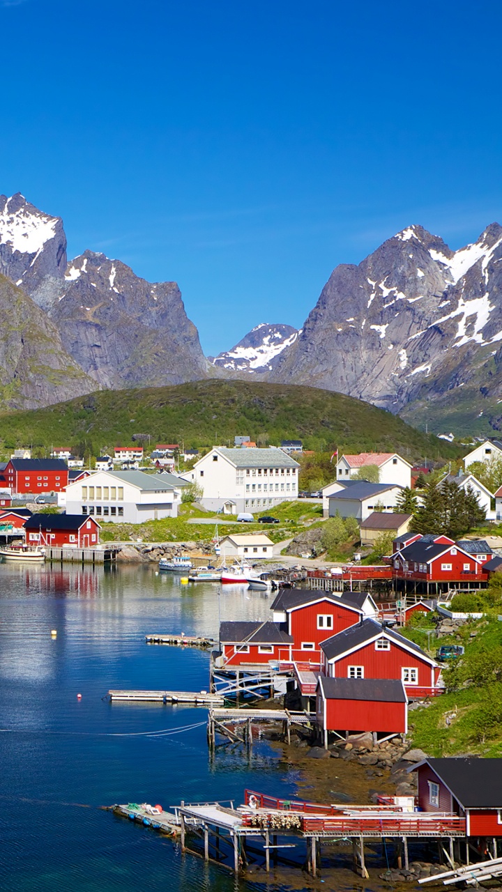 Обои фьорд, Лофотен, рыбацкая деревня, горный рельеф, гора для HD Samsung Galaxy S3/J3/J4/J5, Meizu M5, Sony Xperia L1/L2, заставка, 720x1280 картинка