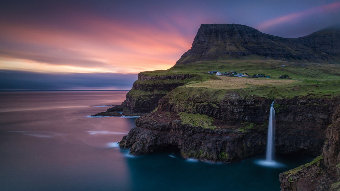 Обои 1366x768 водопад, природа, море, побережье, обрыв, HD ready картинка