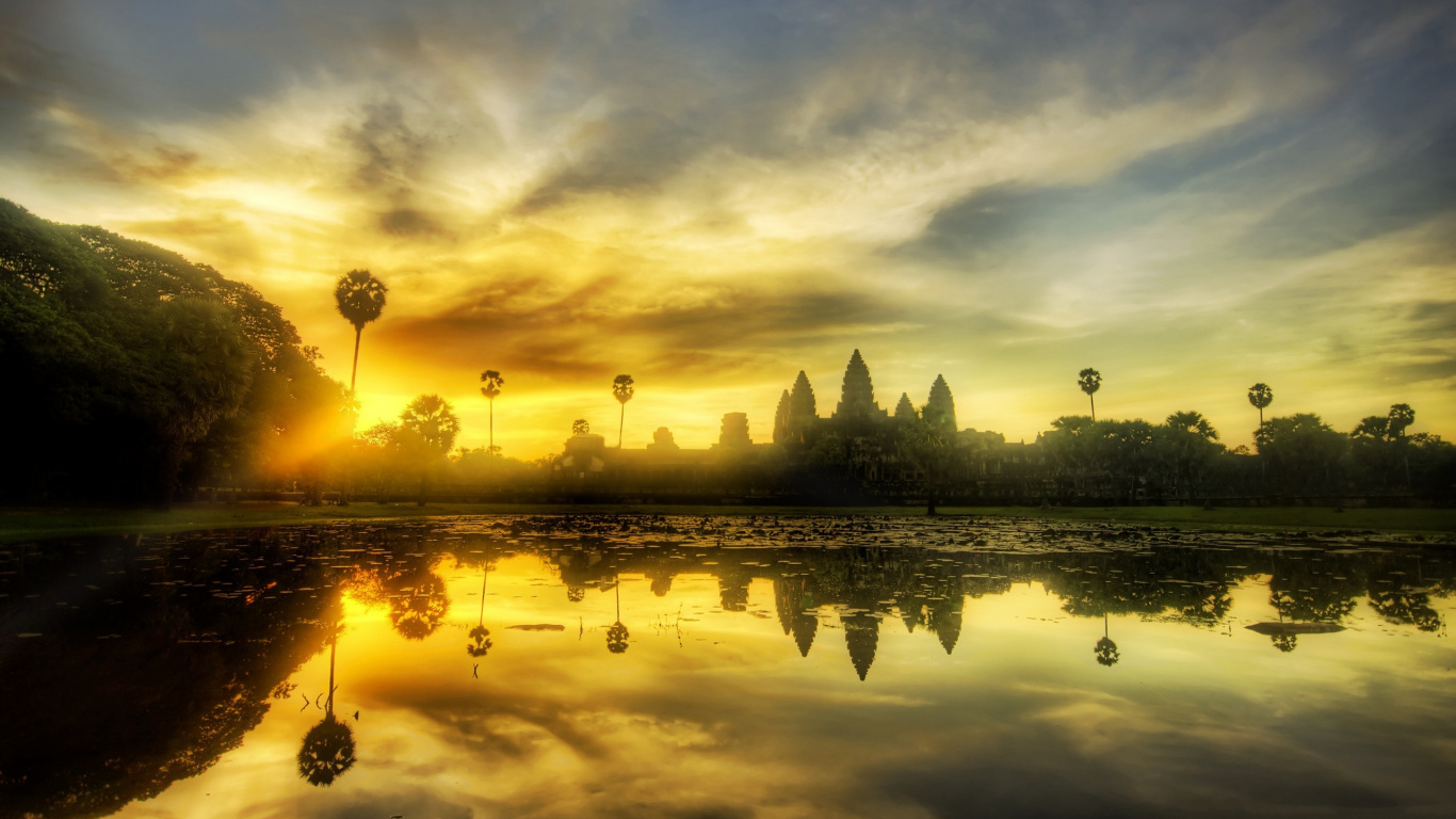Обои 1366x768 Ангкор ВАТ, природа, отражение, вода, утро, HD ready картинка
