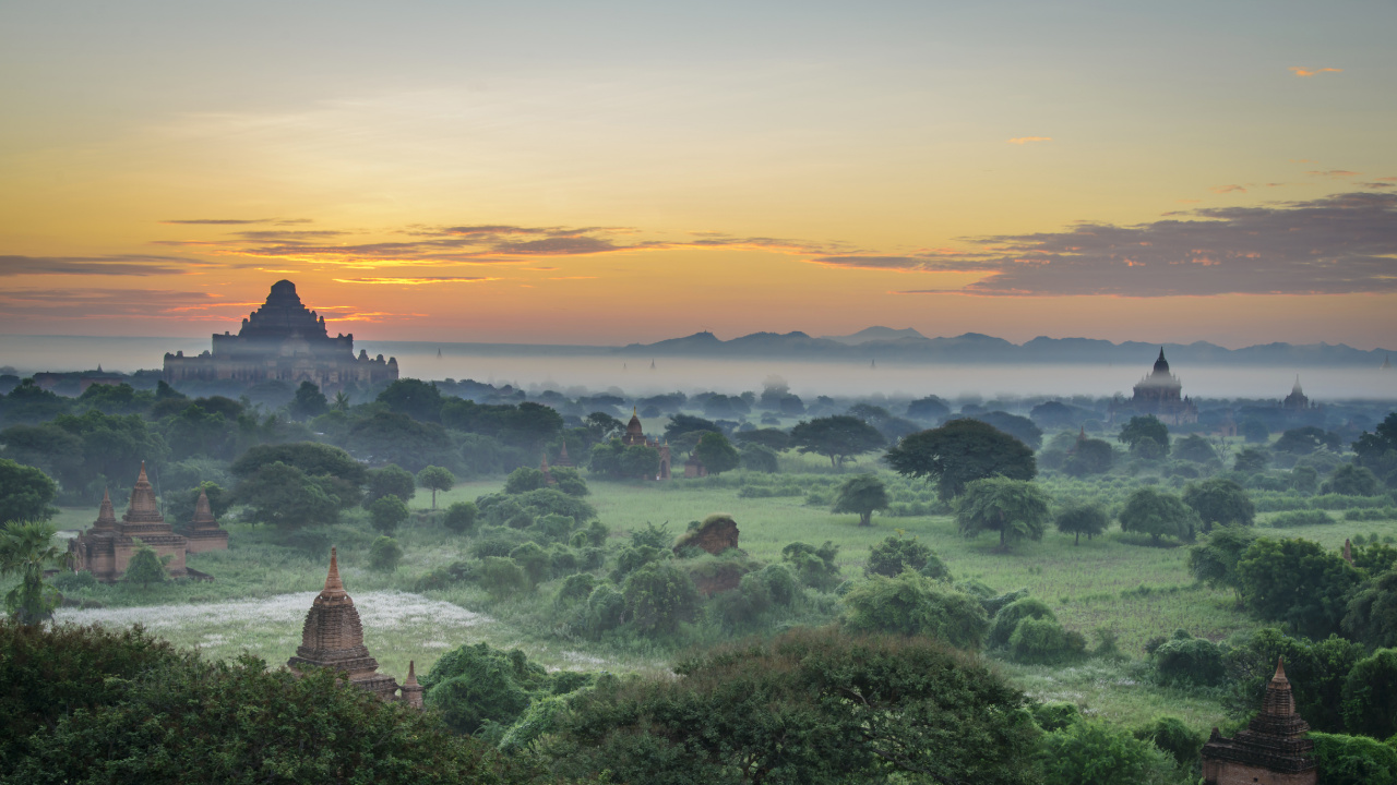 Обои 1280x720 природа, утро, восход солнца, туман, храм, HD, HDV, 720p, 16:9 картинка
