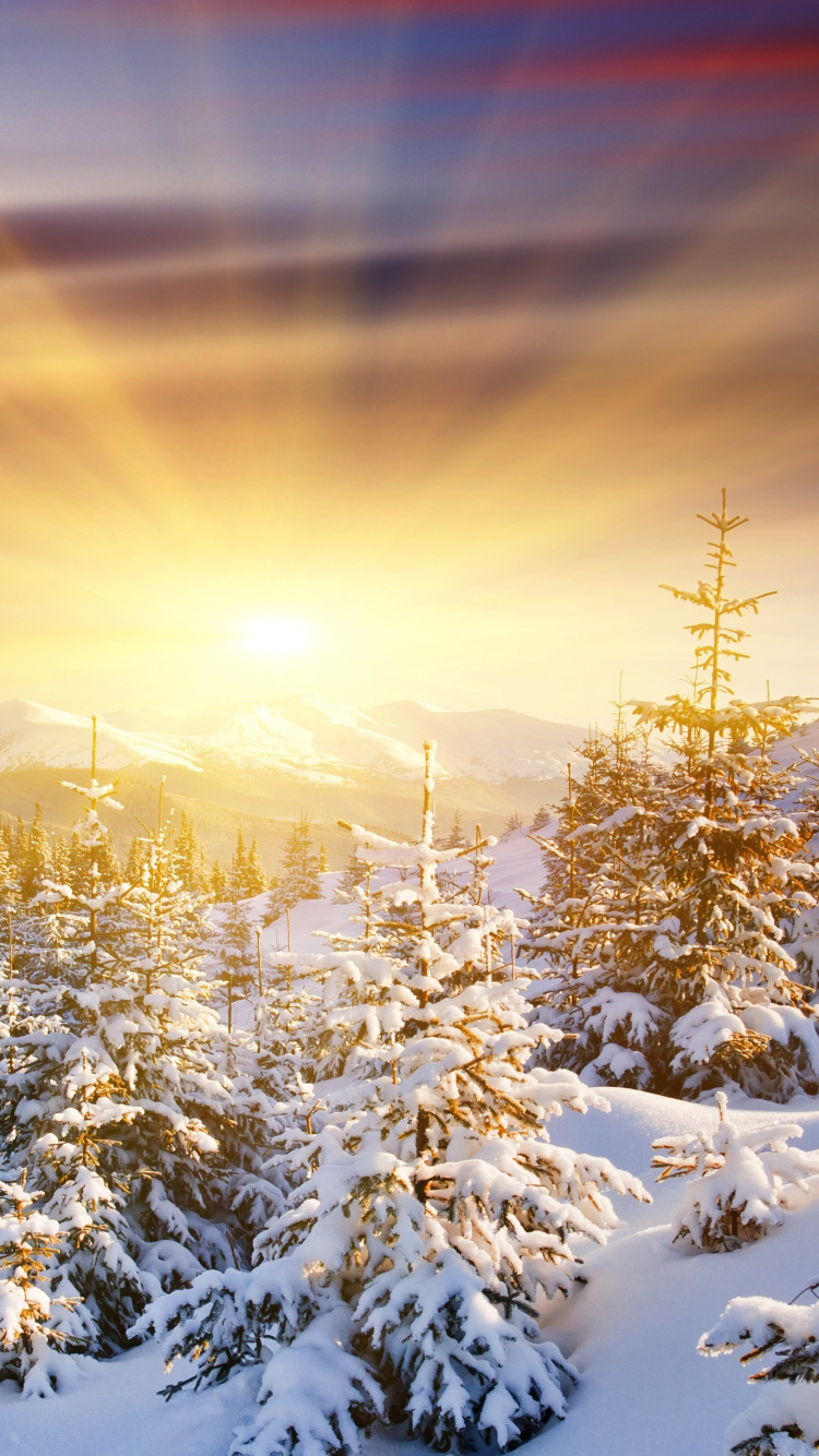 Обои восход солнца, зима, снег, природа, природный ландшафт для iPhone 6, 6S, 7, 8, заставка, 750x1334 картинка