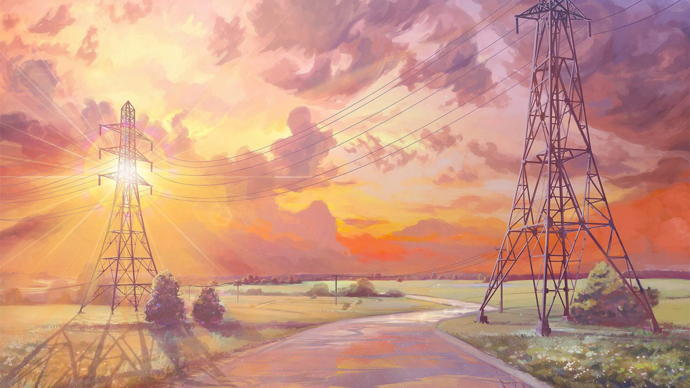Обои 1366x768 арт, электричество, башня передачи, послесвечение, электроснабжение, HD ready картинка