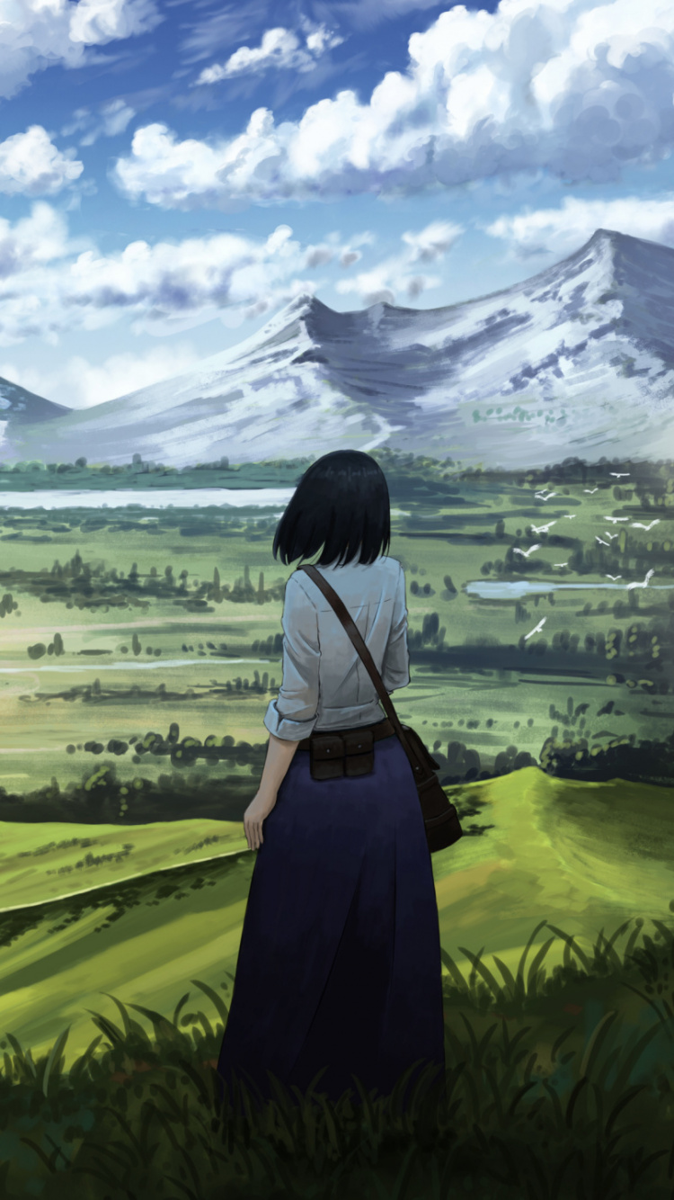Обои аниме, природа, сенокосное угодье, нагорье, горный рельеф для iPhone 6, 6S, 7, 8, заставка, 750x1334 картинка