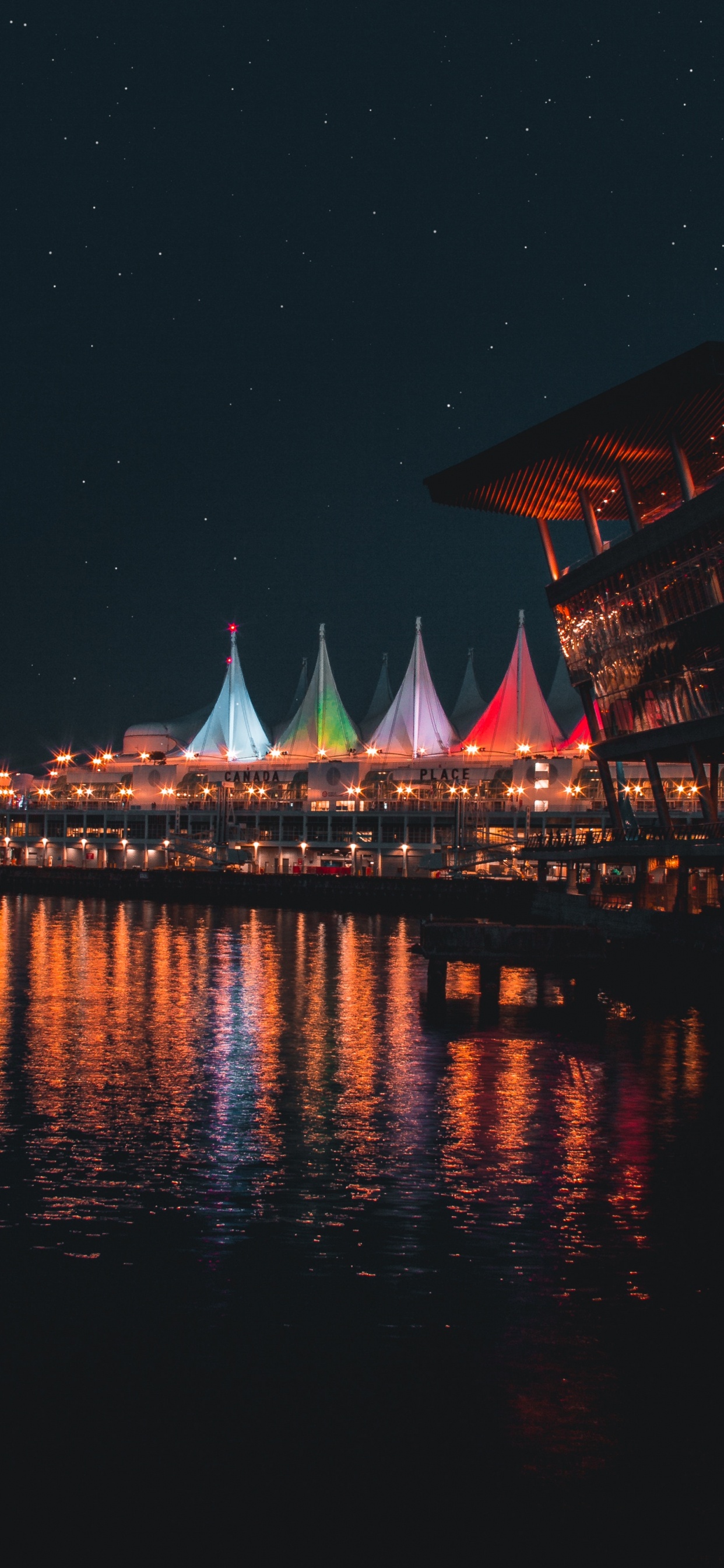 Обои ночь, вода, отражение, красный цвет, ориентир для iPhone XS Max, заставка, 1242x2688 картинка