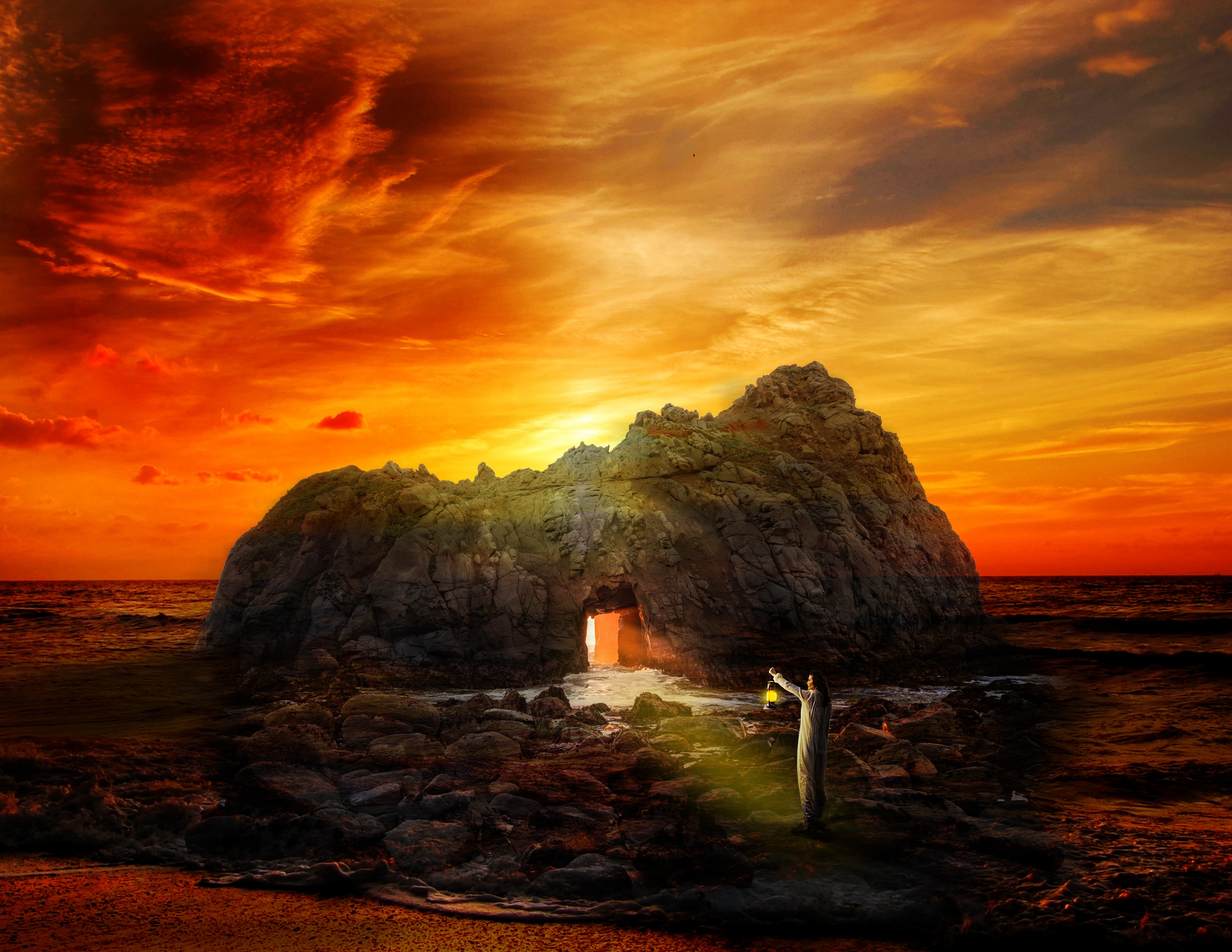 Обои природа, закат, горизонт, рок, море, фото, заставка