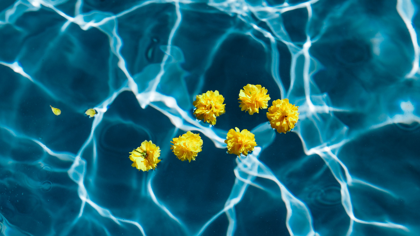 Обои 1366x768 цветок, синий, желтый, вода, растение, HD ready картинка