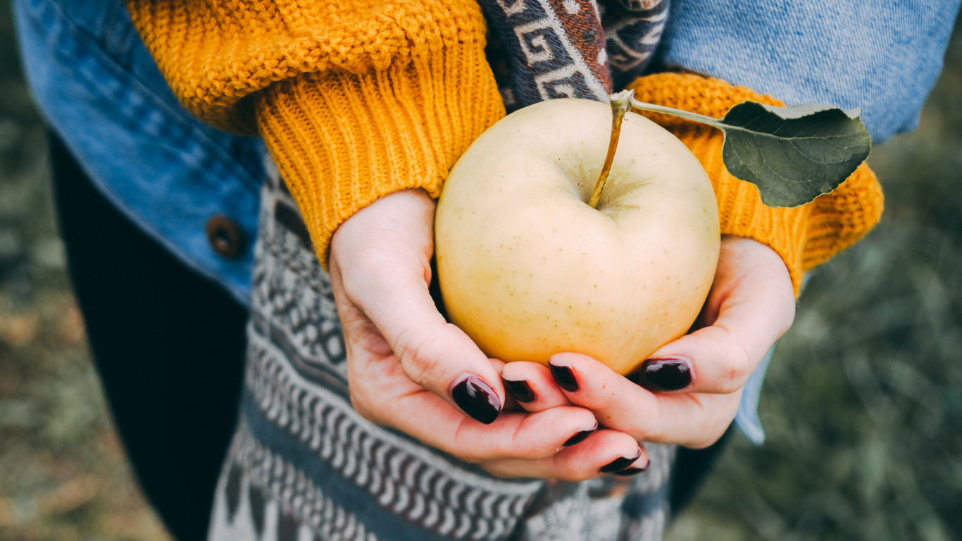 Обои 1366x768 осень, apple, желтый, фрукты, ребенок, HD ready картинка