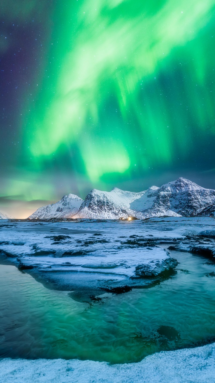 Обои Аврора, природа, природный ландшафт, ледяная форма, ледник для HD Samsung Galaxy S3/J3/J4/J5, Meizu M5, Sony Xperia L1/L2, заставка, 720x1280 картинка