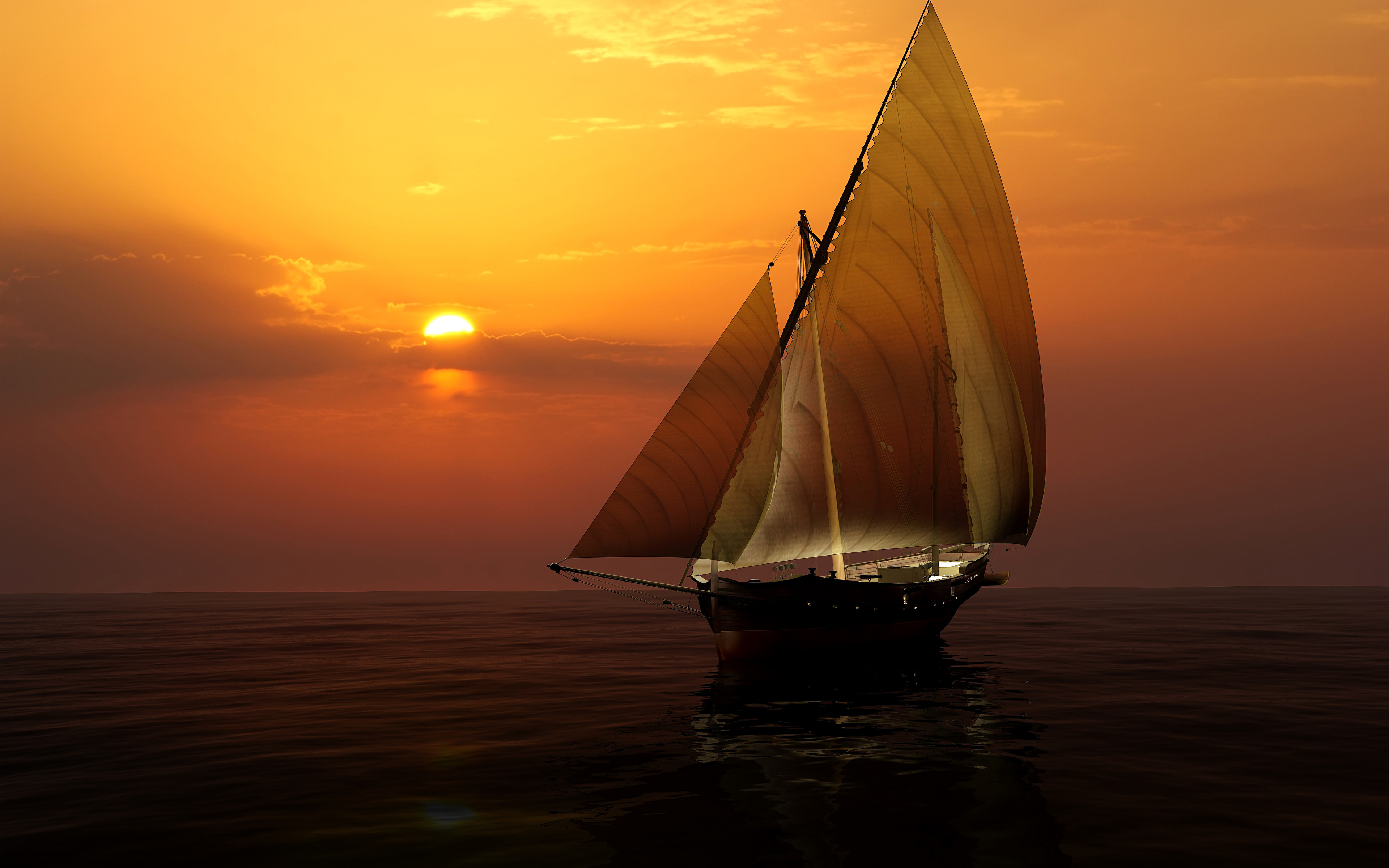 Обои закат, корабль, парусник, парусная шлюпка, мореплавание, фото, заставка