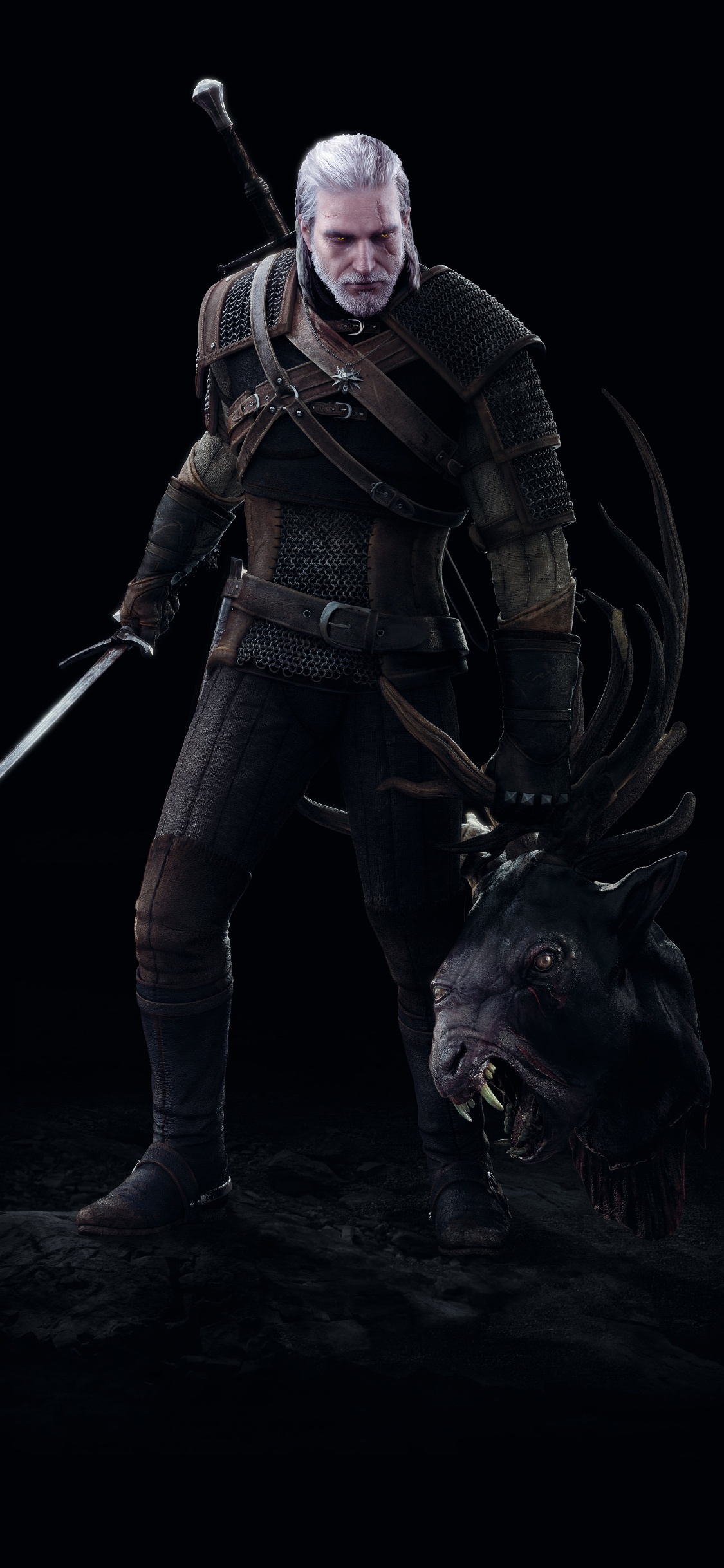 Обои Ведьмак 3 дикая охота, Геральт из ривии, темнота, фигурка, верхняя одежда для iPhone X / XS, заставка, 1125x2436 картинка