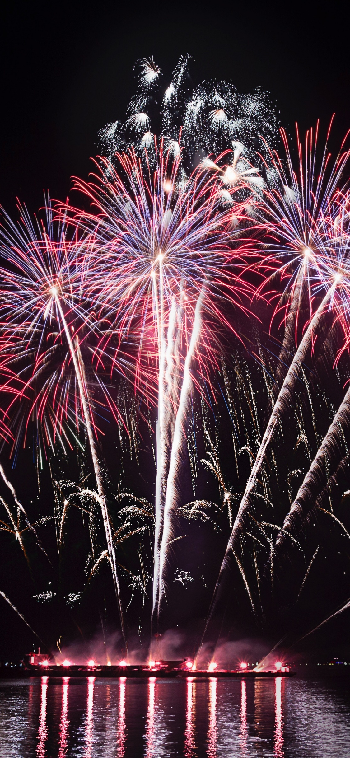 Обои салют, ночь, природа, отражение, день нового года для iPhone X / XS, заставка, 1125x2436 картинка