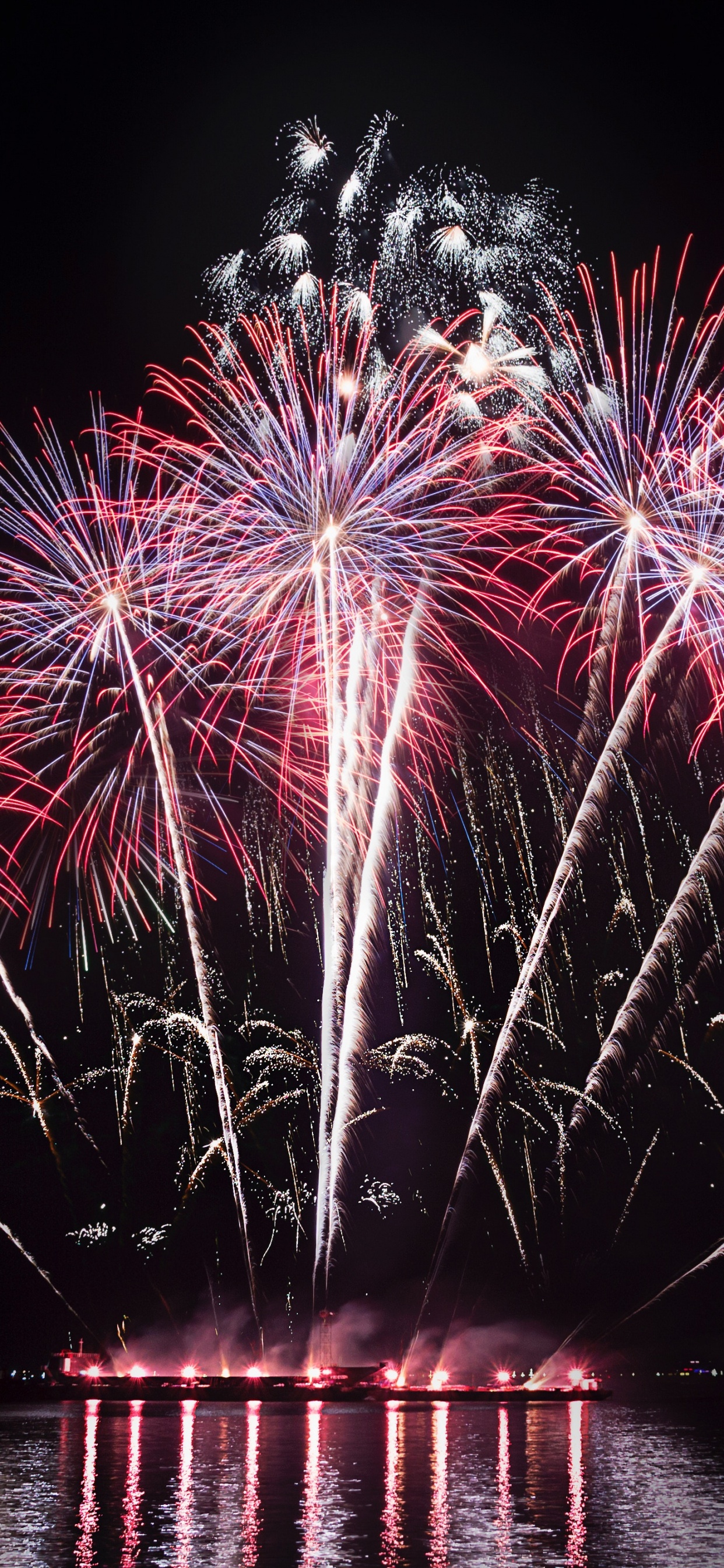 Обои салют, ночь, природа, отражение, день нового года для iPhone XS Max, заставка, 1242x2688 картинка