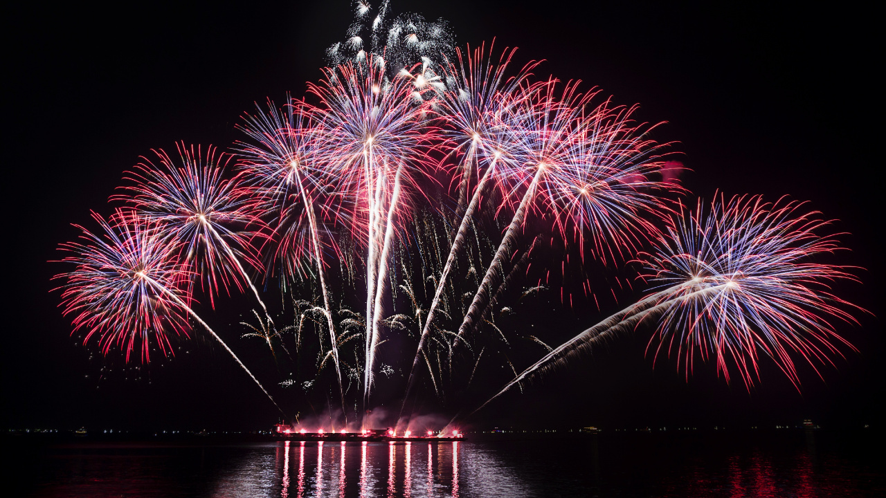 Обои 1280x720 салют, ночь, природа, отражение, день нового года, HD, HDV, 720p, 16:9 картинка