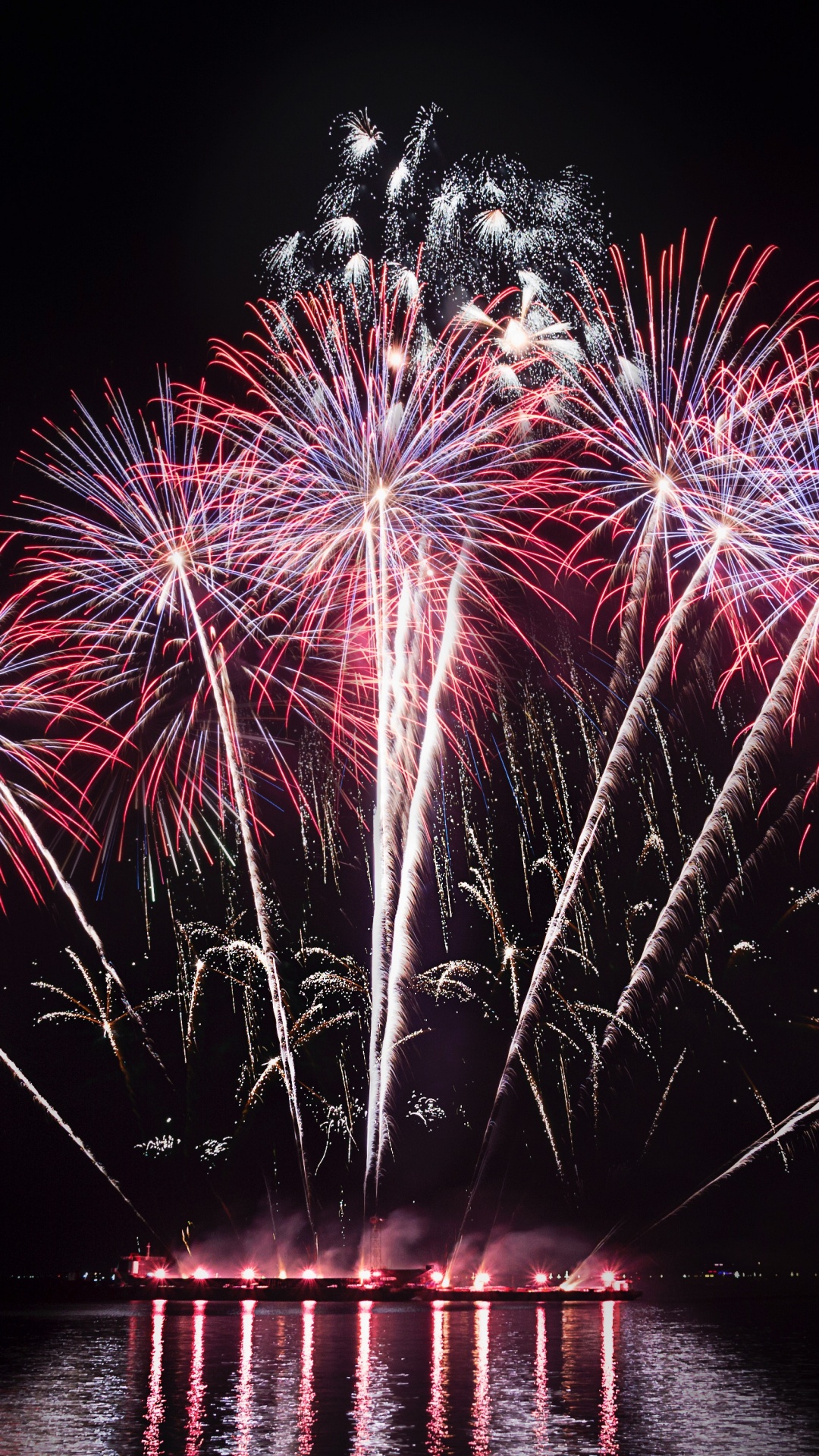Обои салют, ночь, природа, отражение, день нового года для iPhone 6S+/7+/8+, заставка, 1080x1920 картинка