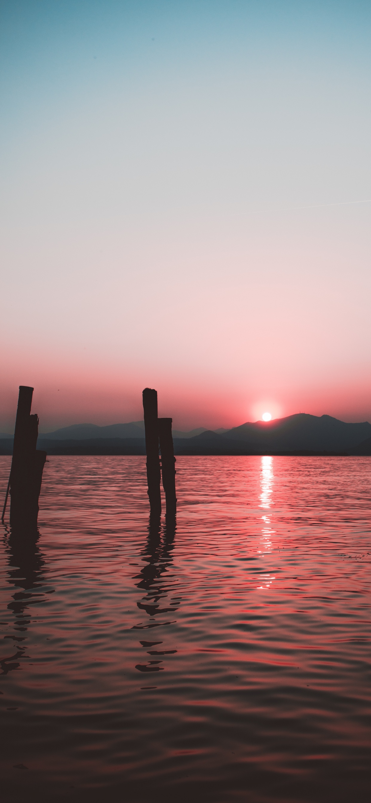 Обои закат, горизонт, восход солнца, водоем, послесвечение для iPhone XS Max, заставка, 1242x2688 картинка