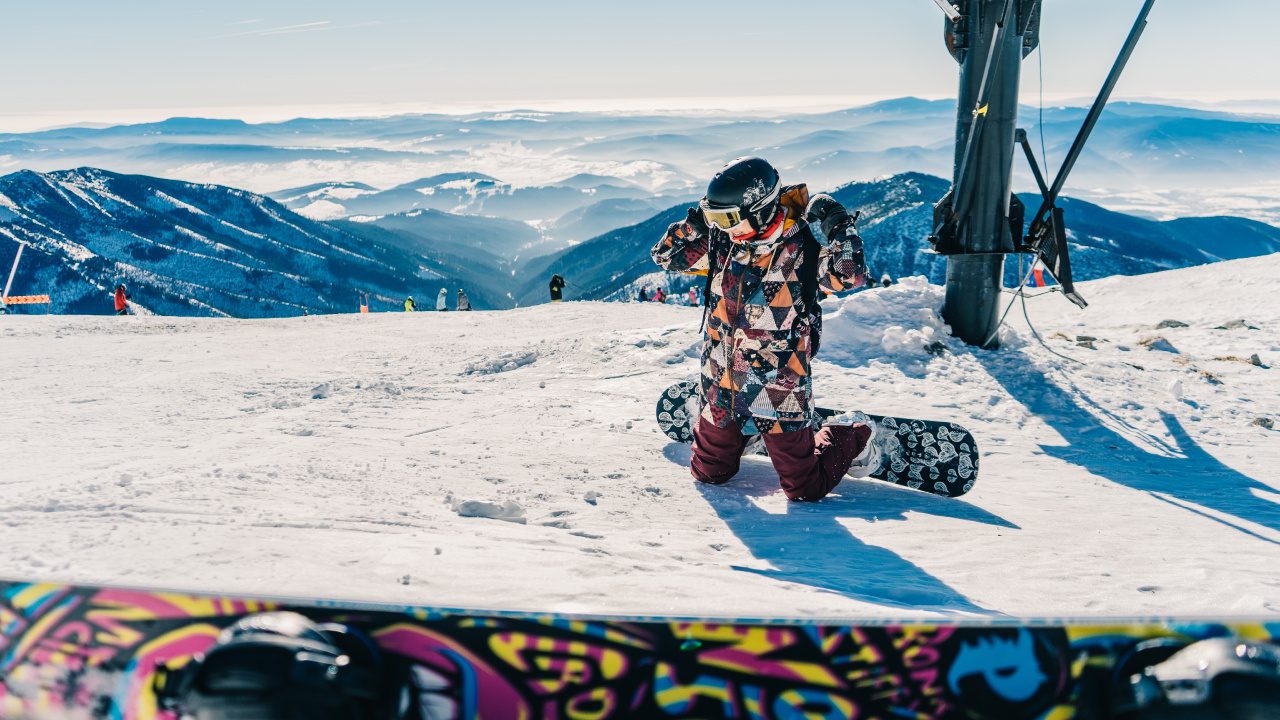 Обои 1280x720 сноуборд, снег, зима, гора, обувь, HD, HDV, 720p, 16:9 картинка
