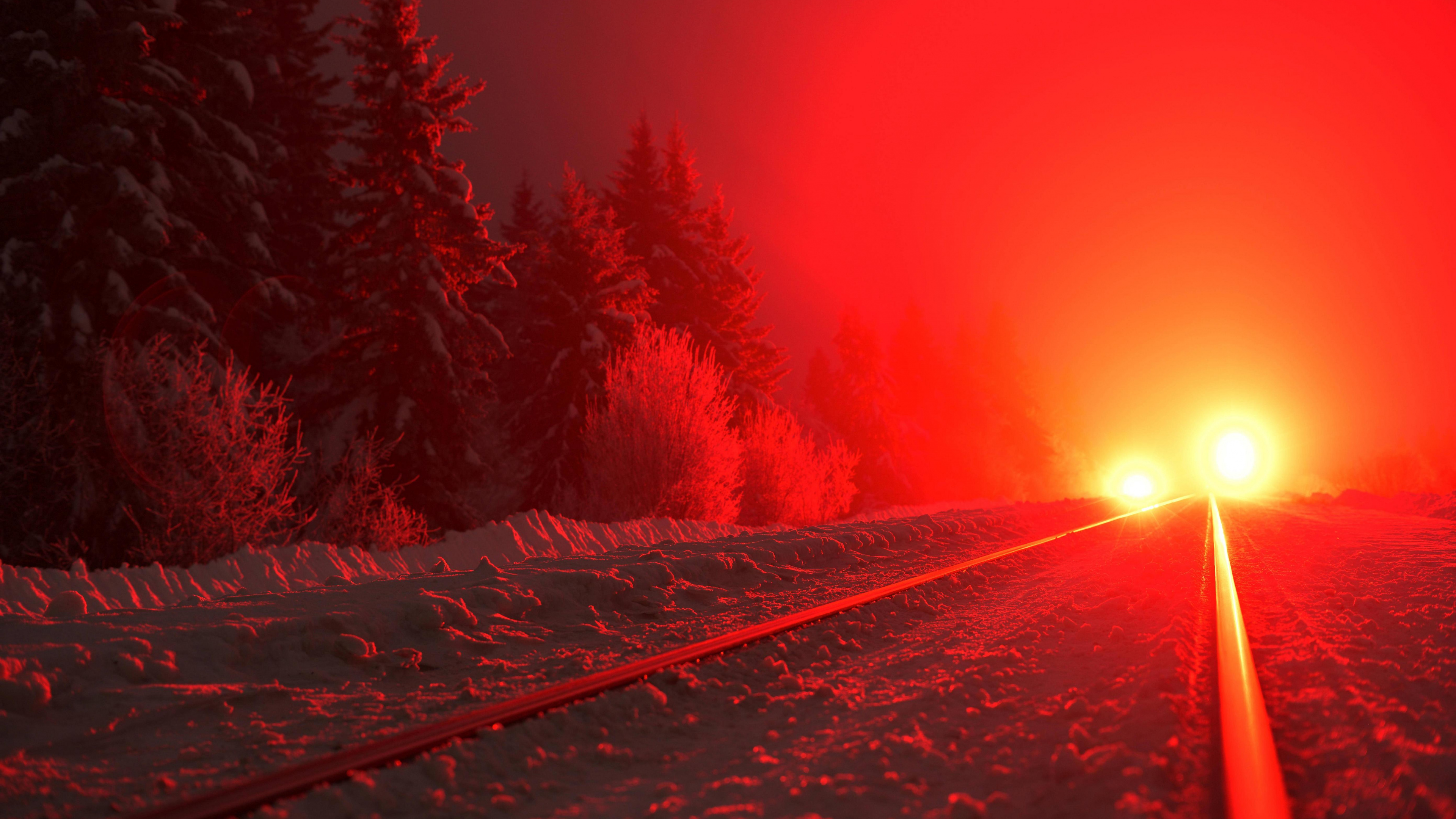 Обои 3840x2160 железнодорожный транспорт, красный цвет, свет, дерево, вспышка, 4K Ultra HD картинка