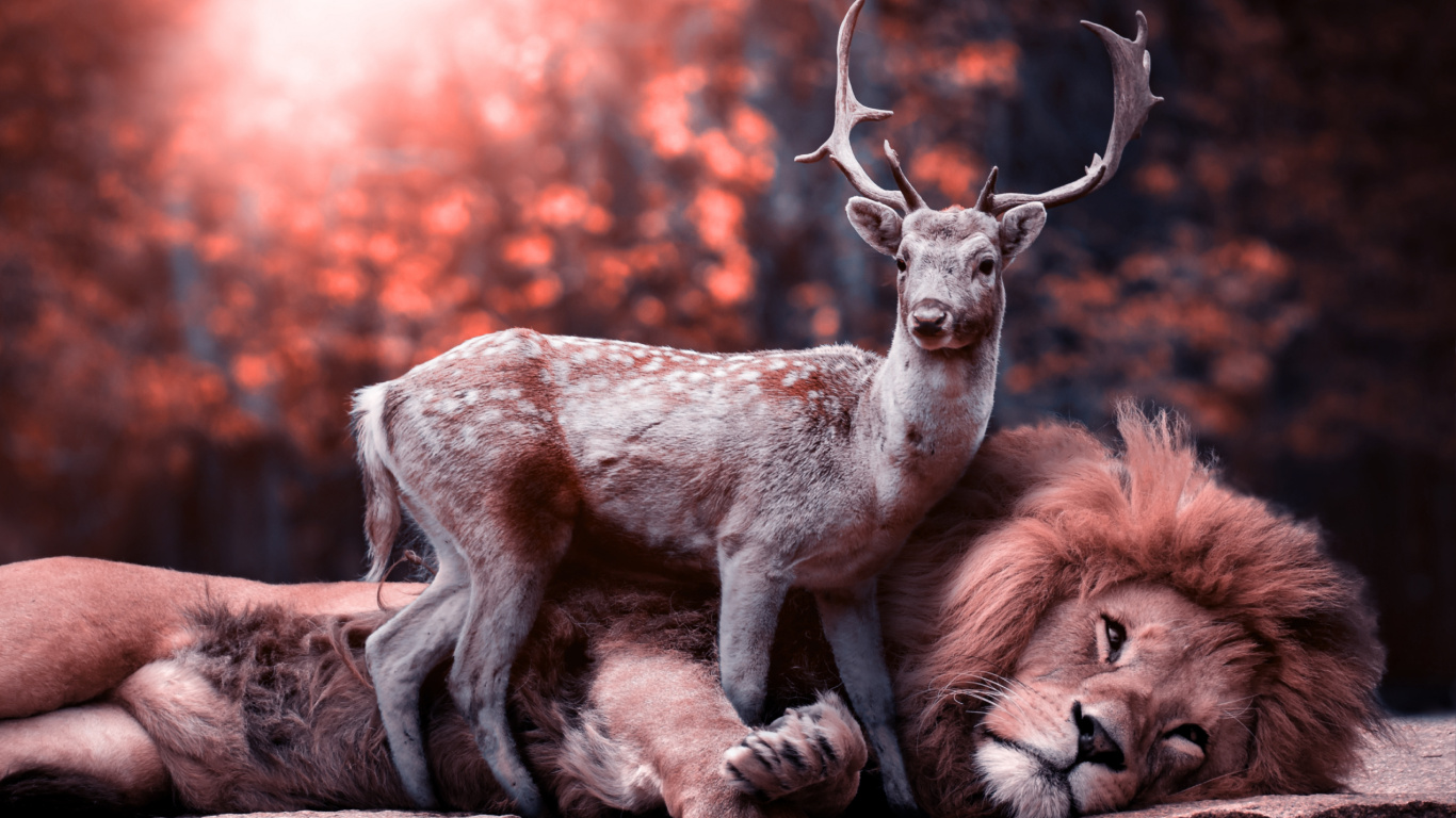 Обои 1366x768 Лев, олень, красный олень, живая природа, Северный олень, HD ready картинка