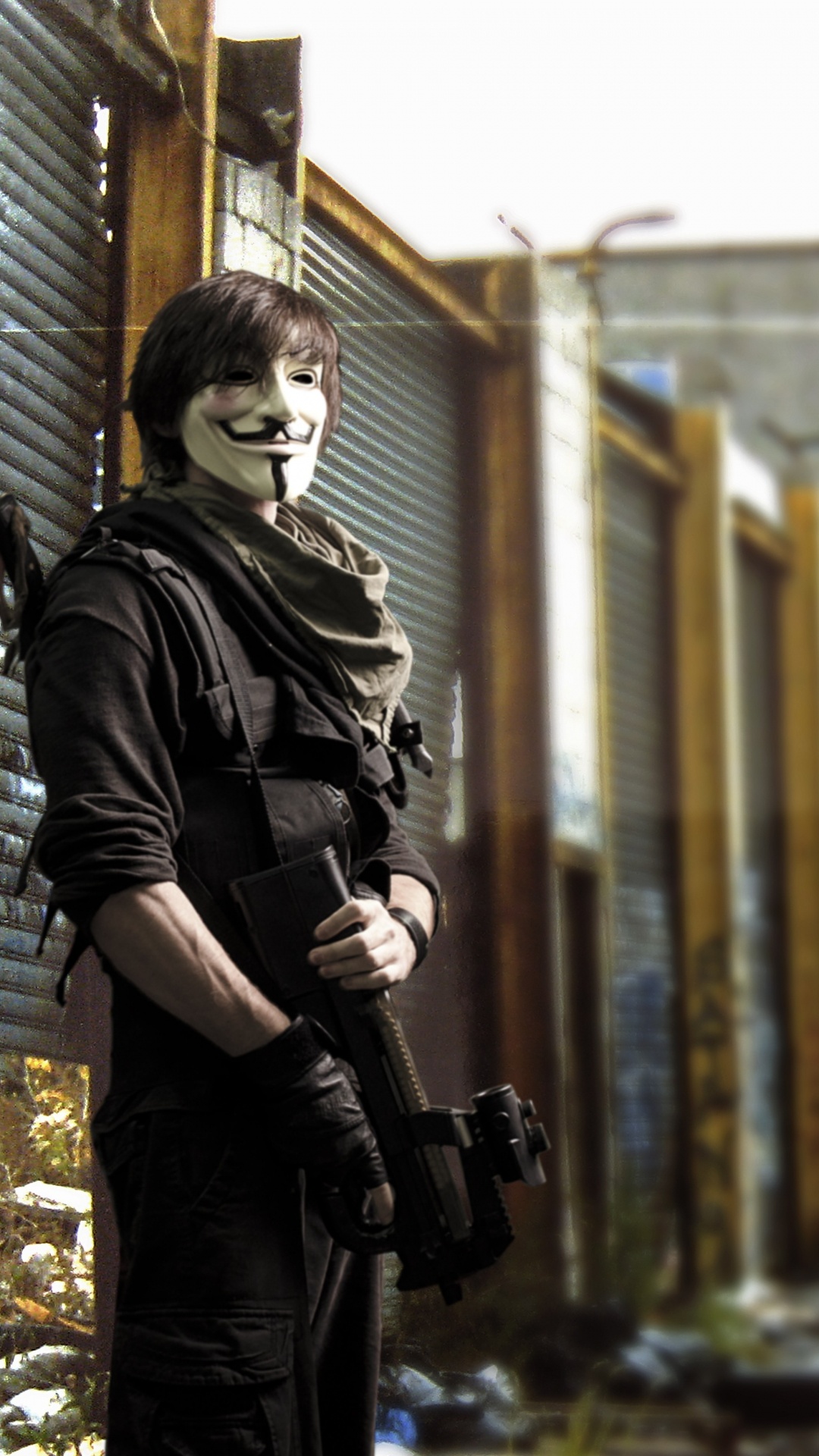 Обои анонимный солдат, Гая Фокса маска, солдат, стояние, улица для iPhone 6S+/7+/8+, заставка, 1080x1920 картинка