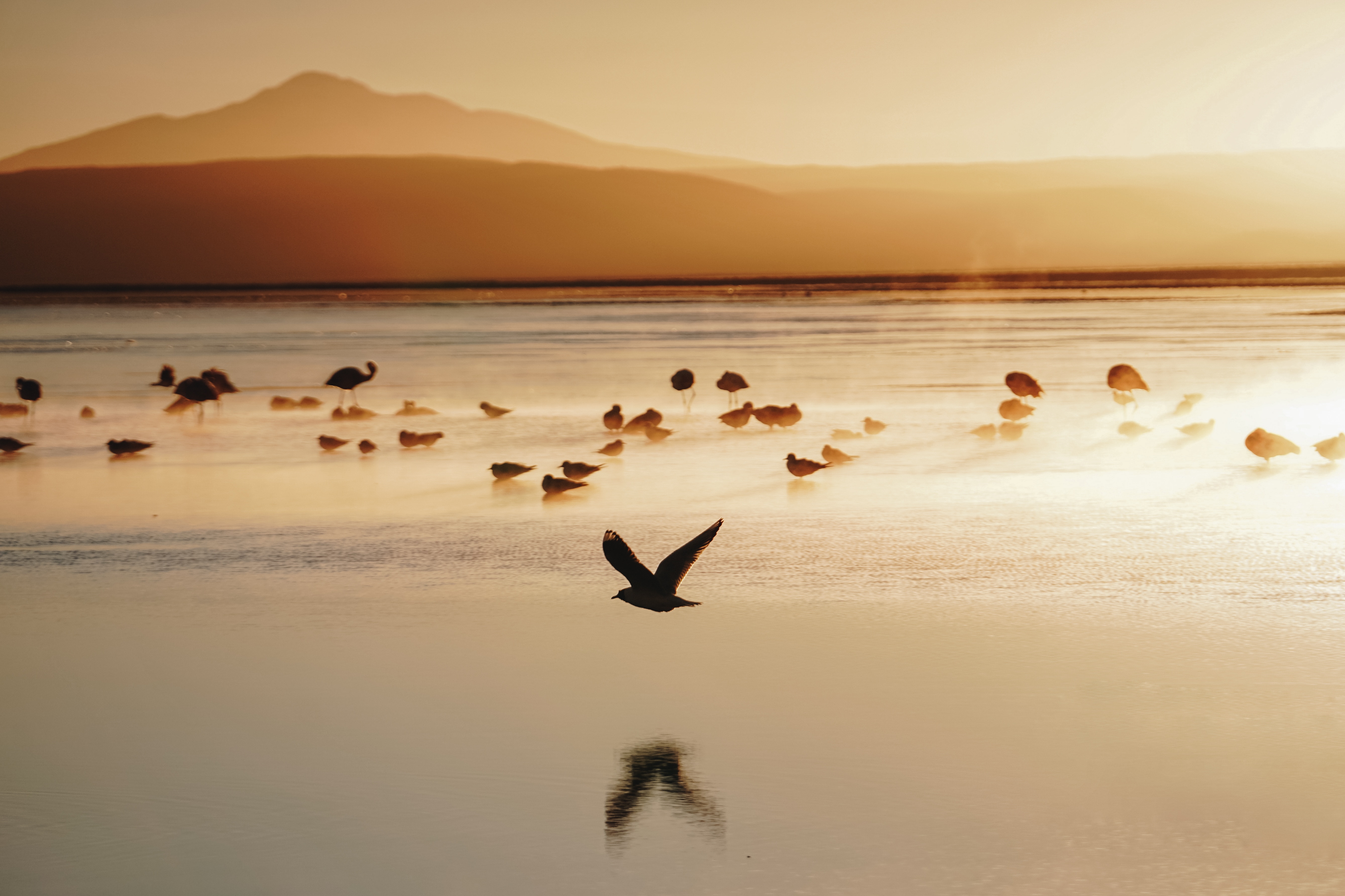 Обои утро, море, закат, морская птица, спокойный, фото, заставка