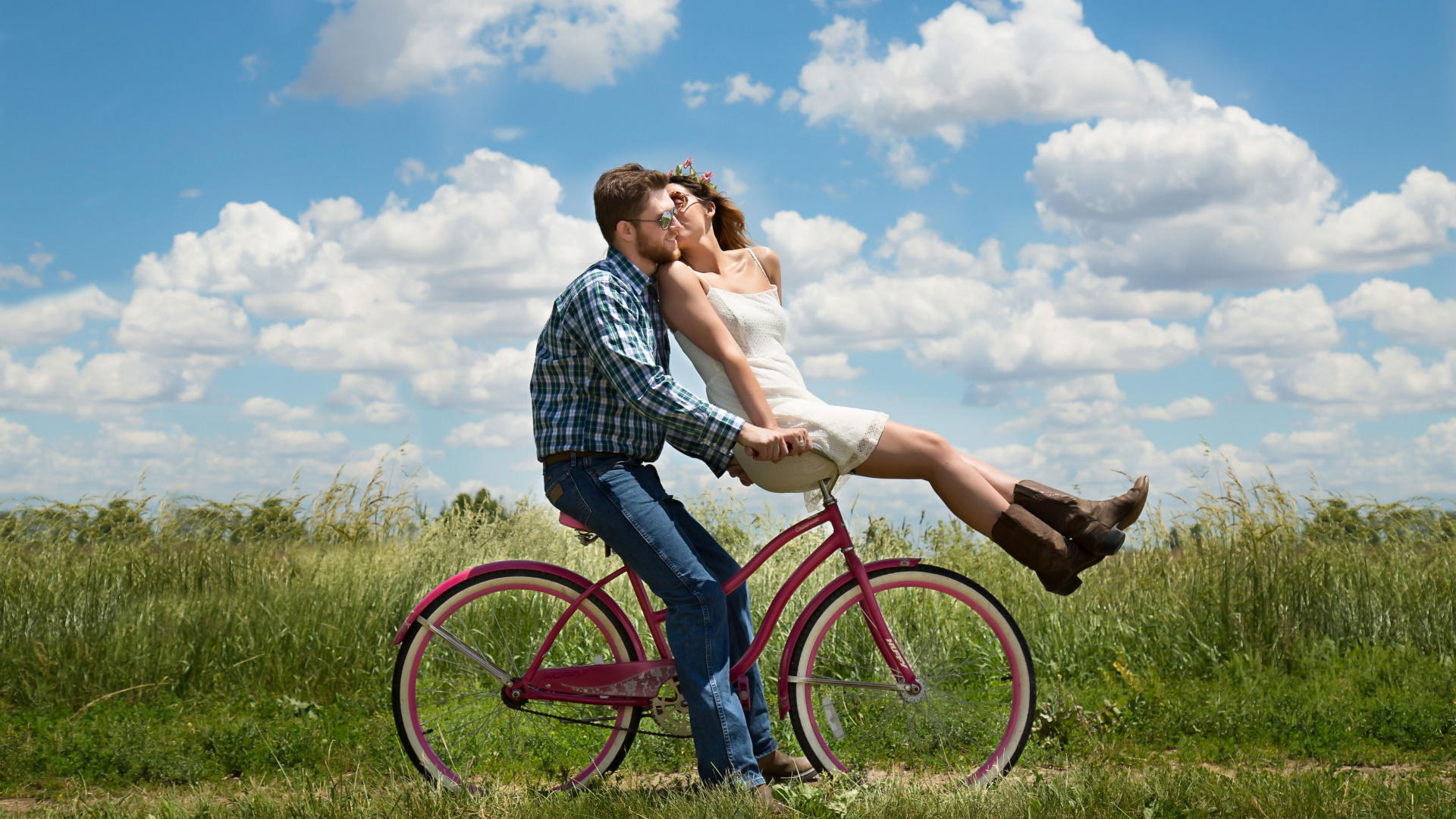 Обои 1920x1080 пара, роман, Люди в природе, велосипед, сенокосное угодье, Full HD, HDTV, 1080p 16:9 картинка