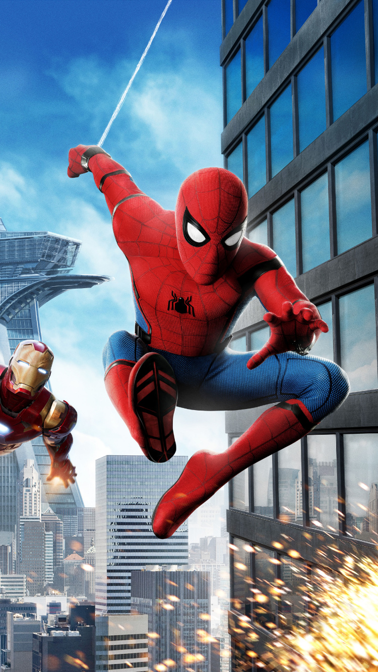 Обои человек-паук, Железный человек, Человек-паук Возвращение домой, город, метрополия для iPhone 6, 6S, 7, 8, заставка, 750x1334 картинка