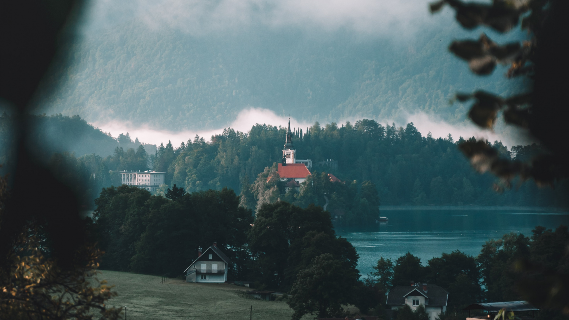 Обои 1920x1080 Озеро Блед, озеро, облако, дерево, атмосфера, Full HD, HDTV, 1080p 16:9 картинка