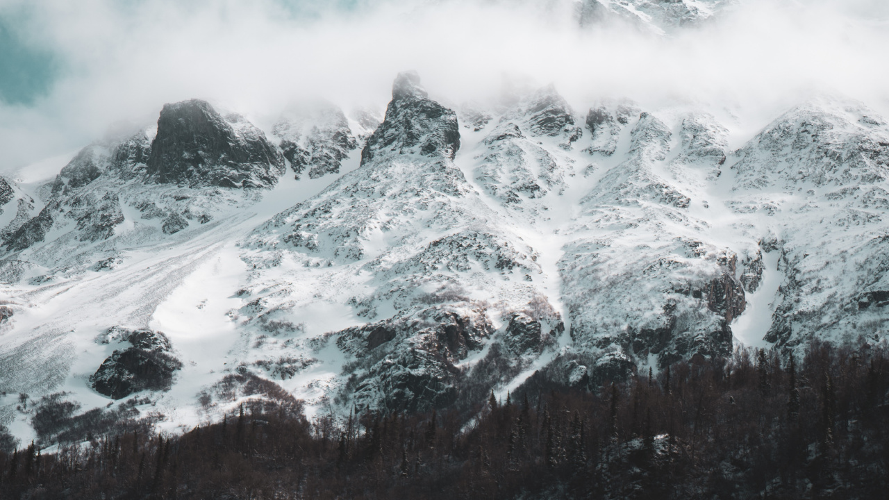 Обои 1280x720 гора, горный рельеф, облако, вода, волна, HD, HDV, 720p, 16:9 картинка
