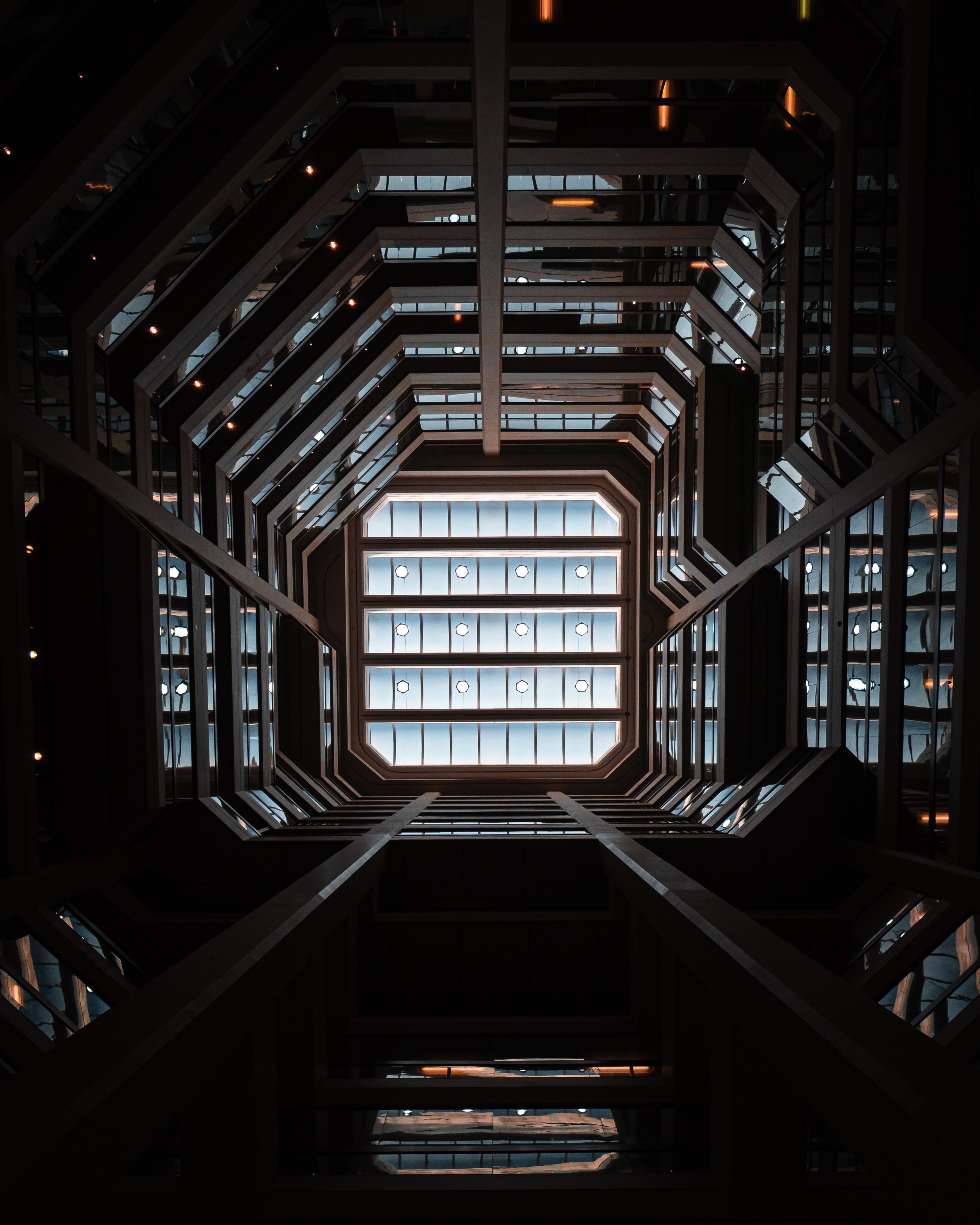 Обои темнота, ночь, свет, симметрия, лестница, фото, заставка