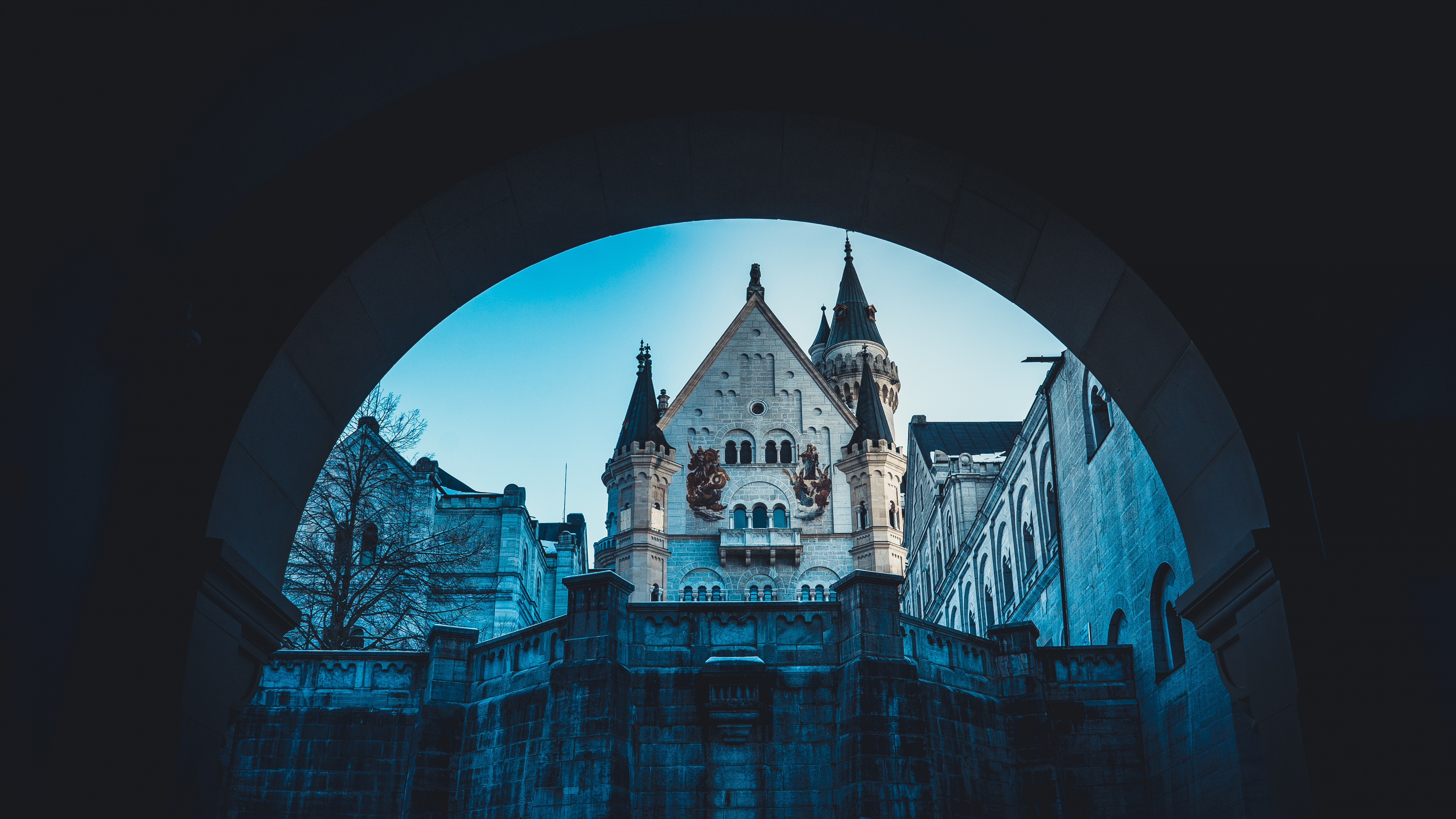 Обои 3840x2160 замок Нойшванштайн, замок, синий, архитектура, отражение, 4K Ultra HD картинка