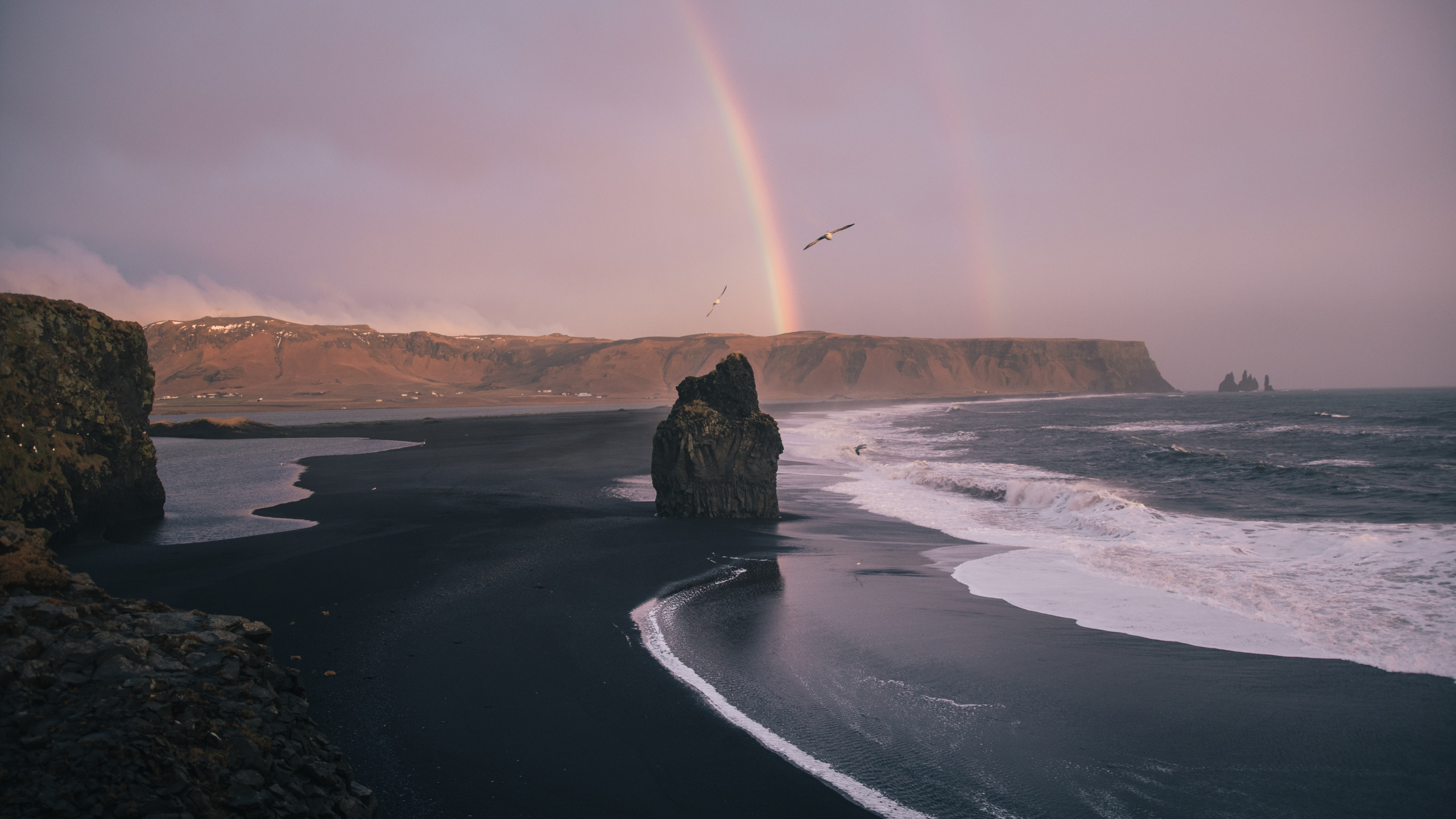 Обои 2560x1440 море, ветровая волна, Радуга, рок, побережье, WQHD, QHD, 16:9 картинка