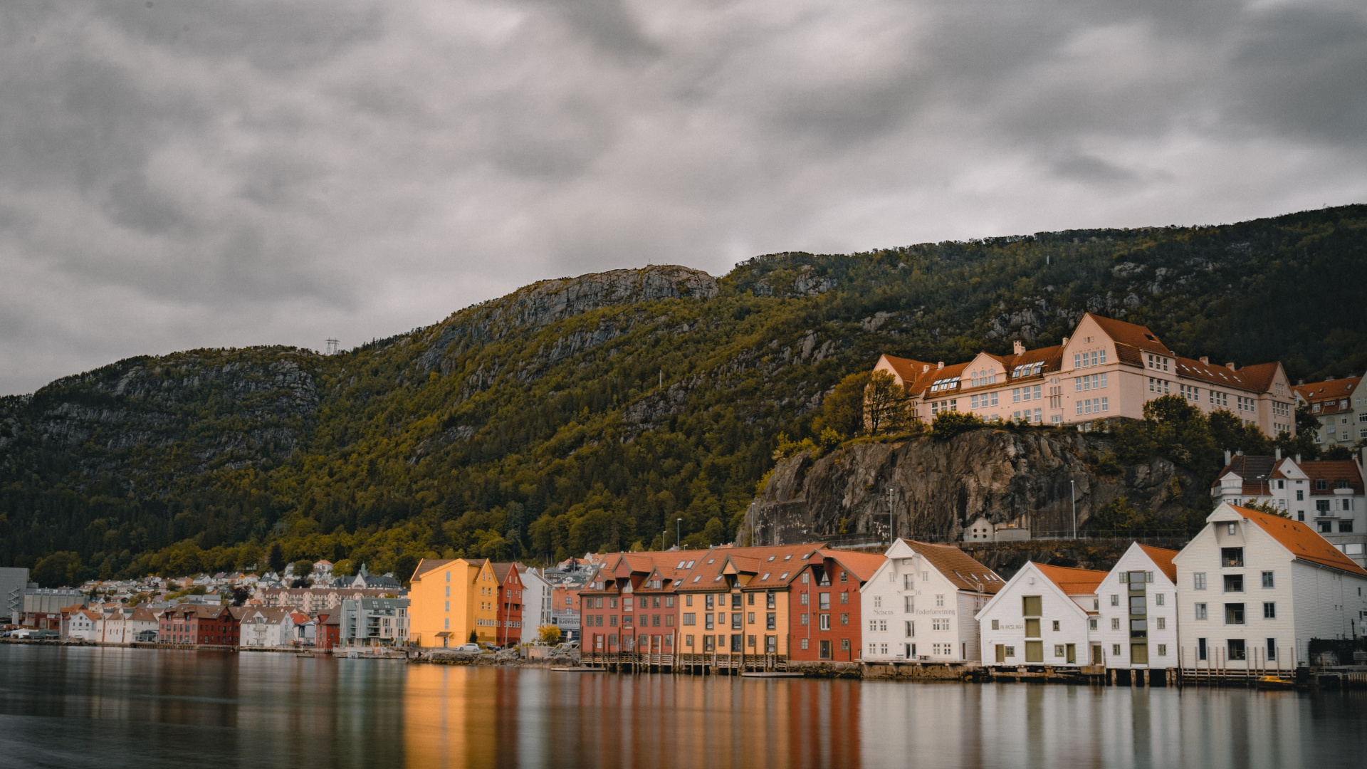 Обои 1920x1080 водный путь, гора, фьорд, озеро, городок, Full HD, HDTV, 1080p 16:9 картинка