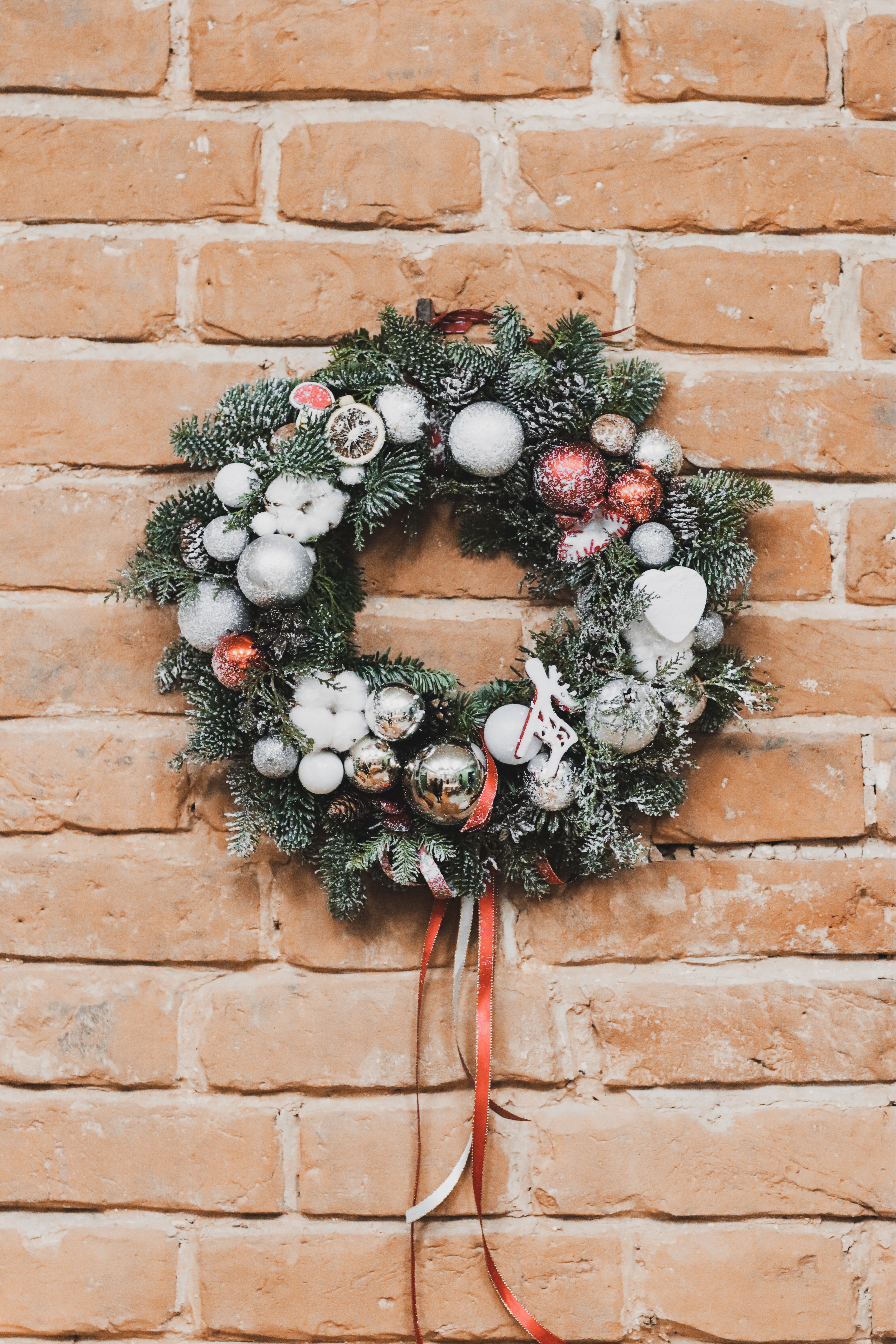 Обои Рождественские украшения, дерево, цветочный дизайн, кирпич, растение, фото, заставка