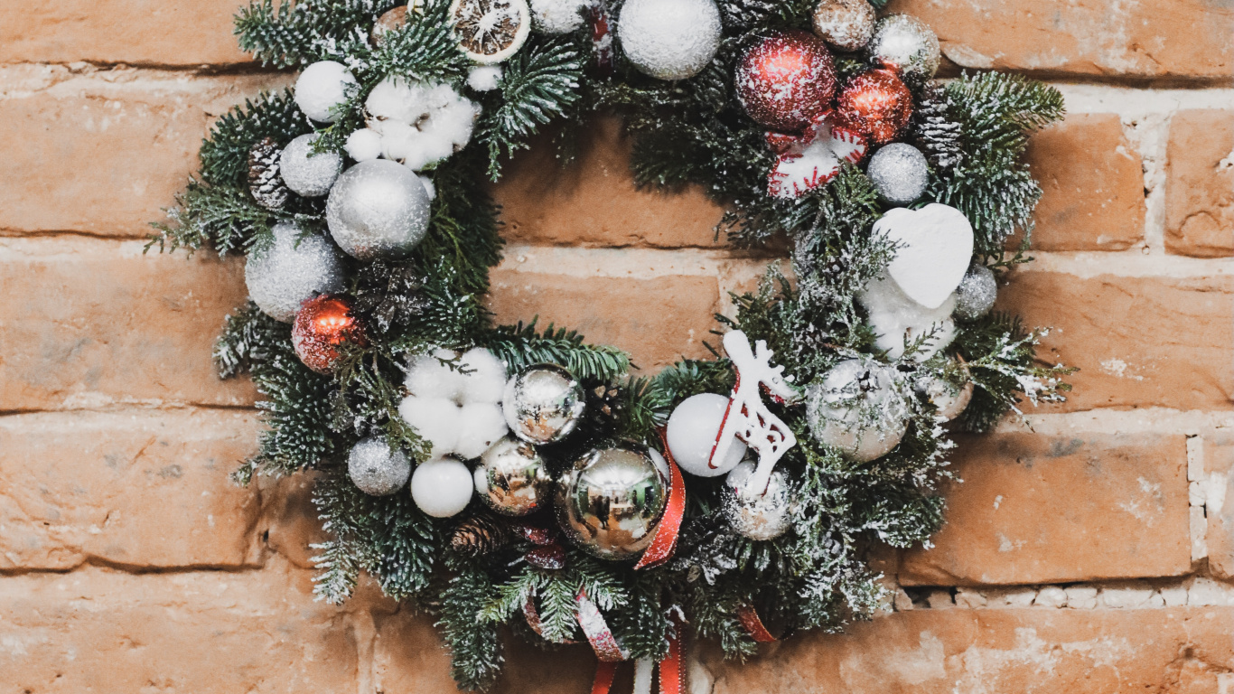 Обои 1366x768 Рождественские украшения, дерево, цветочный дизайн, кирпич, растение, HD ready картинка