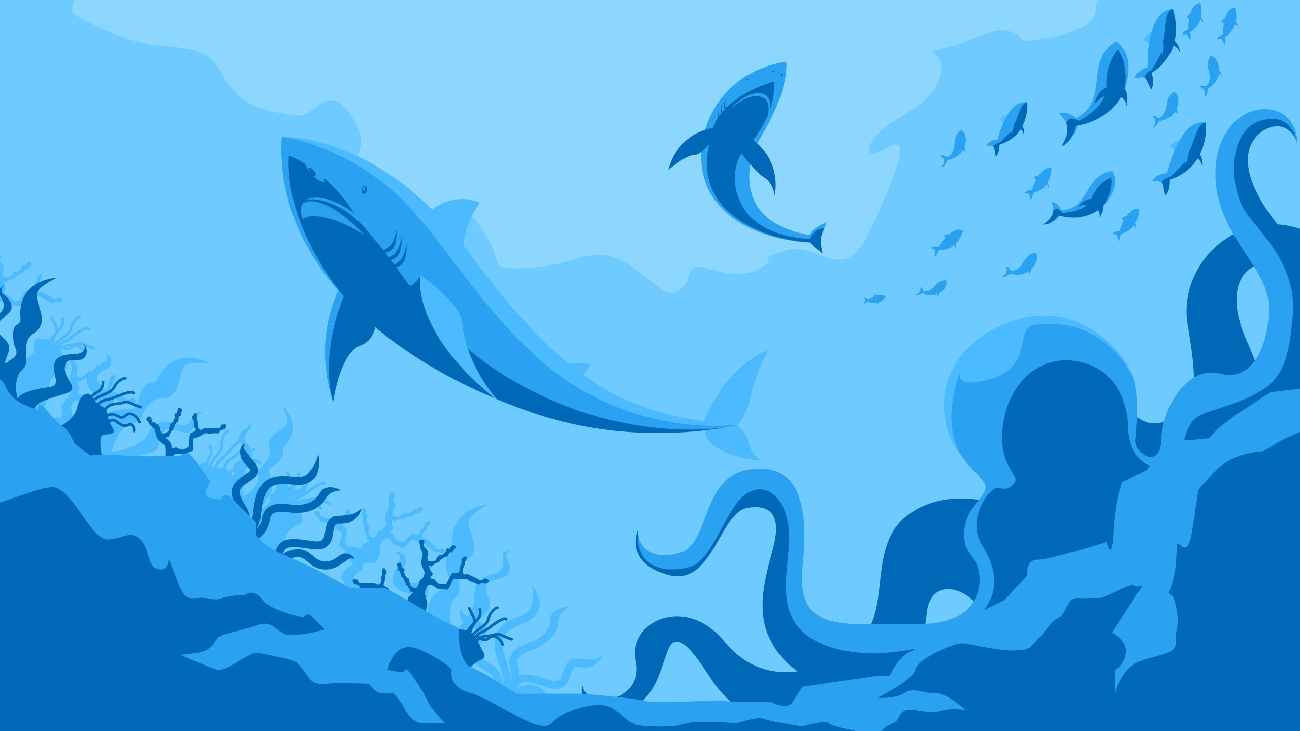 Обои 2560x1440 осьминог, акула, океан, минимализм, синий, WQHD, QHD, 16:9 картинка