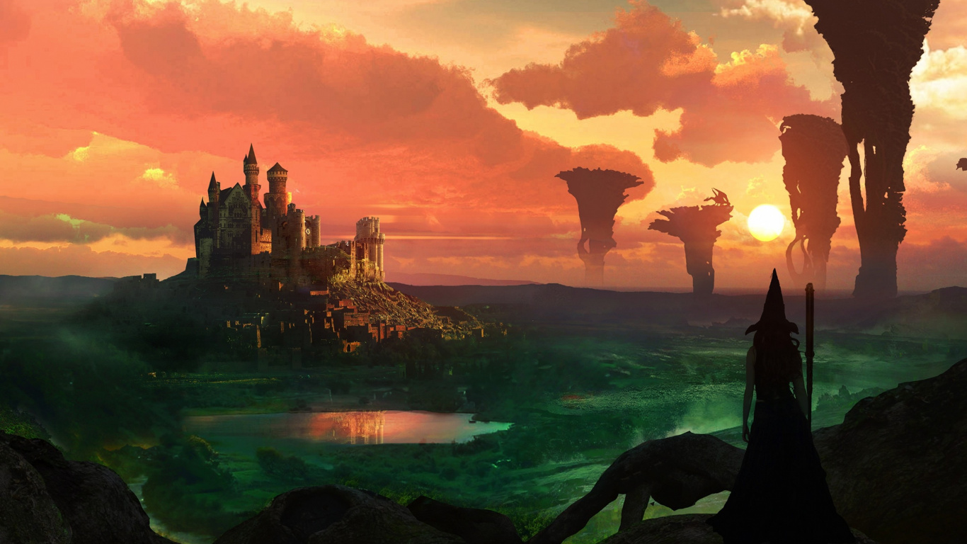 Обои 1366x768 замок, пейзаж, рассвет, восход солнца, магия, HD ready картинка
