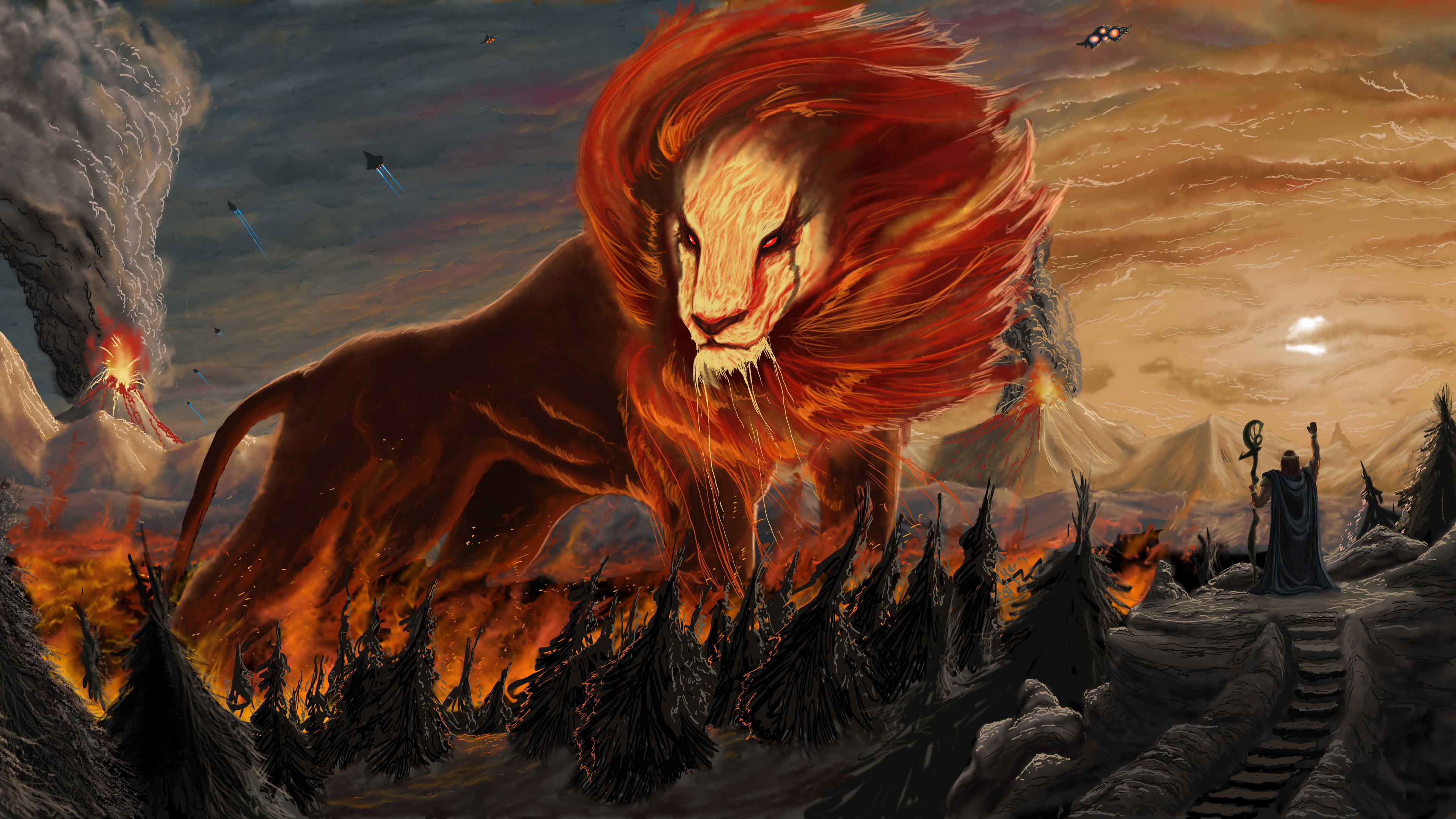 Обои 3840x2160 мифология, вымышленный персонаж, вымирание, Лев, лава, 4K Ultra HD картинка