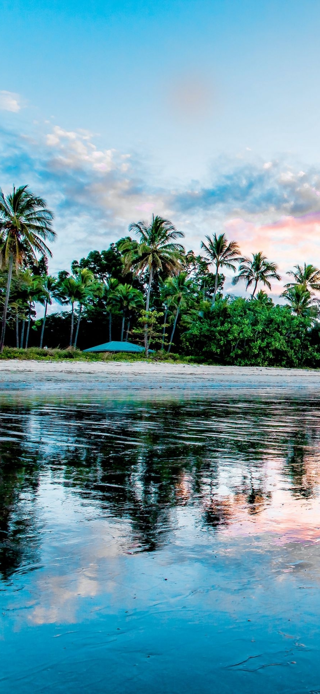Обои отражение, пальмовые рощи, побережье, пляж, берег, фото, заставка
