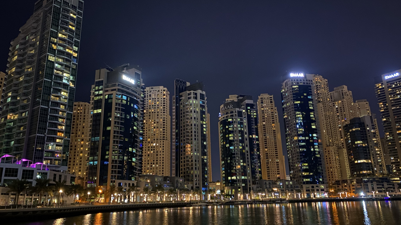 Обои 1366x768 Дубай, Дубай Марина, ночь, башня, метрополия, HD ready картинка