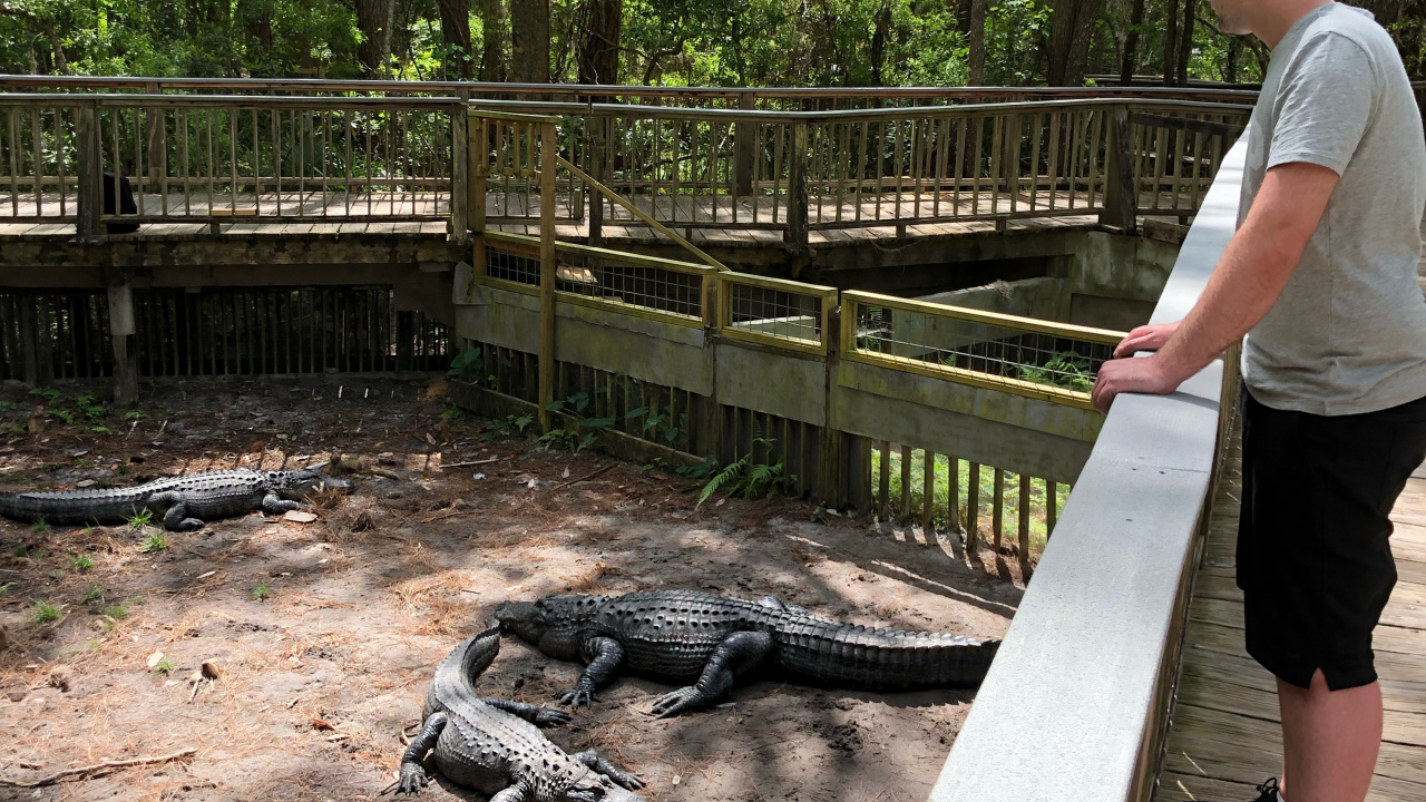 Обои 1280x720 крокодил, вода, человеческое тело, шорты, природный заповедник, HD, HDV, 720p, 16:9 картинка