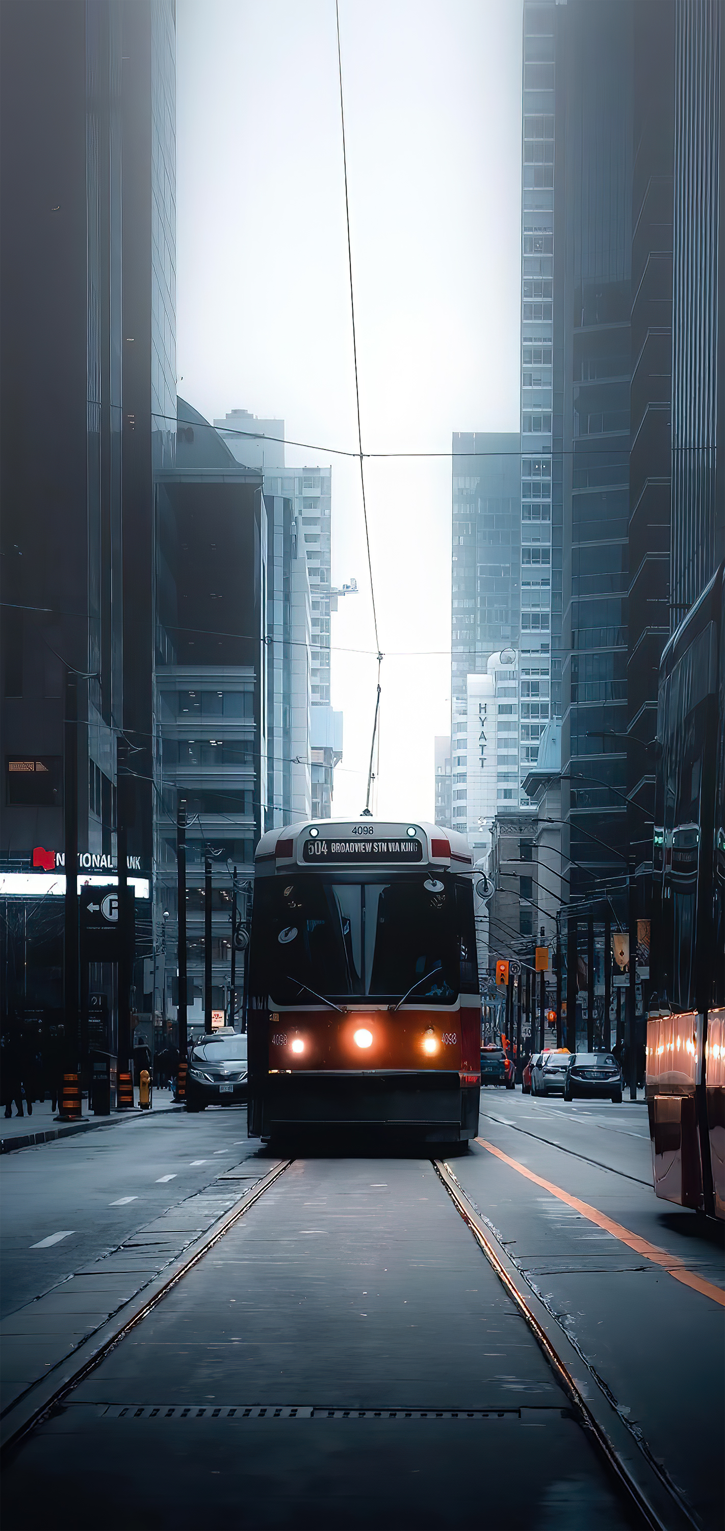 Обои здание, небоскреб, легковые автомобили, автомобильное освещение, автобус, фото, заставка