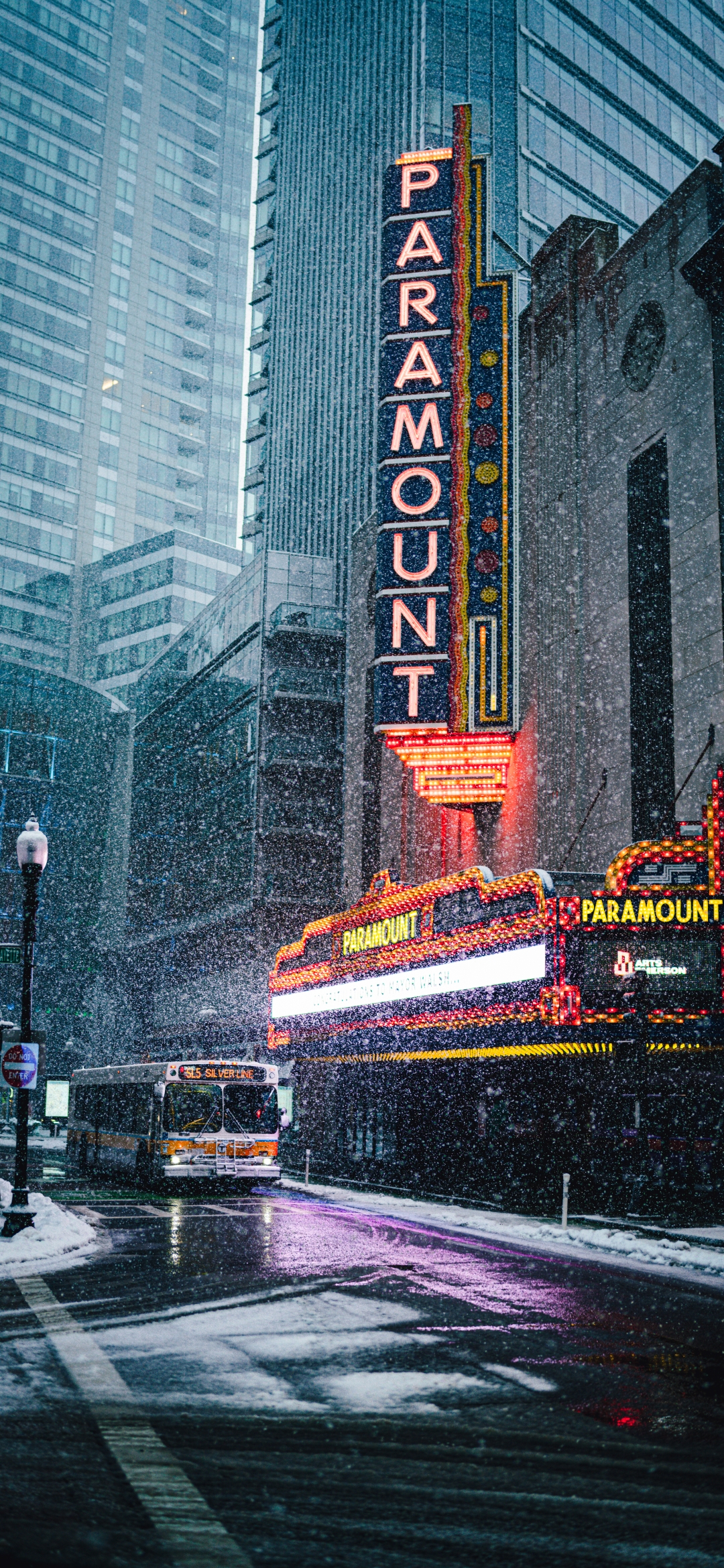 Обои Театр Парамаунт, здание, небоскреб, автобус, автомобильное освещение, фото, заставка