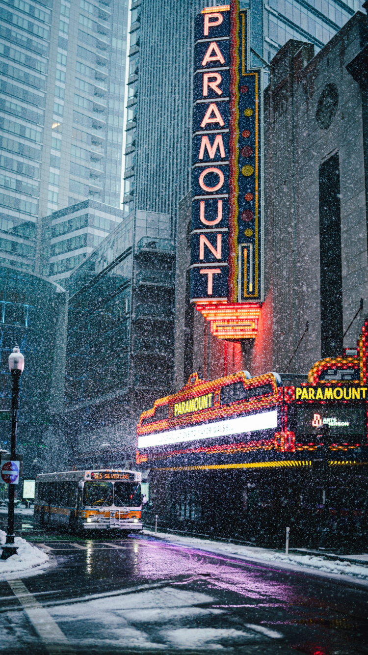 Обои Театр Парамаунт, здание, небоскреб, автобус, автомобильное освещение для iPhone 6, 6S, 7, 8, заставка, 750x1334 картинка