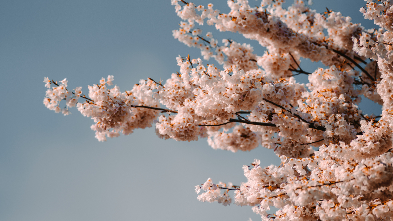 Обои 1280x720 цветок, цветение вишни, синий, розовый, белые, HD, HDV, 720p, 16:9 картинка