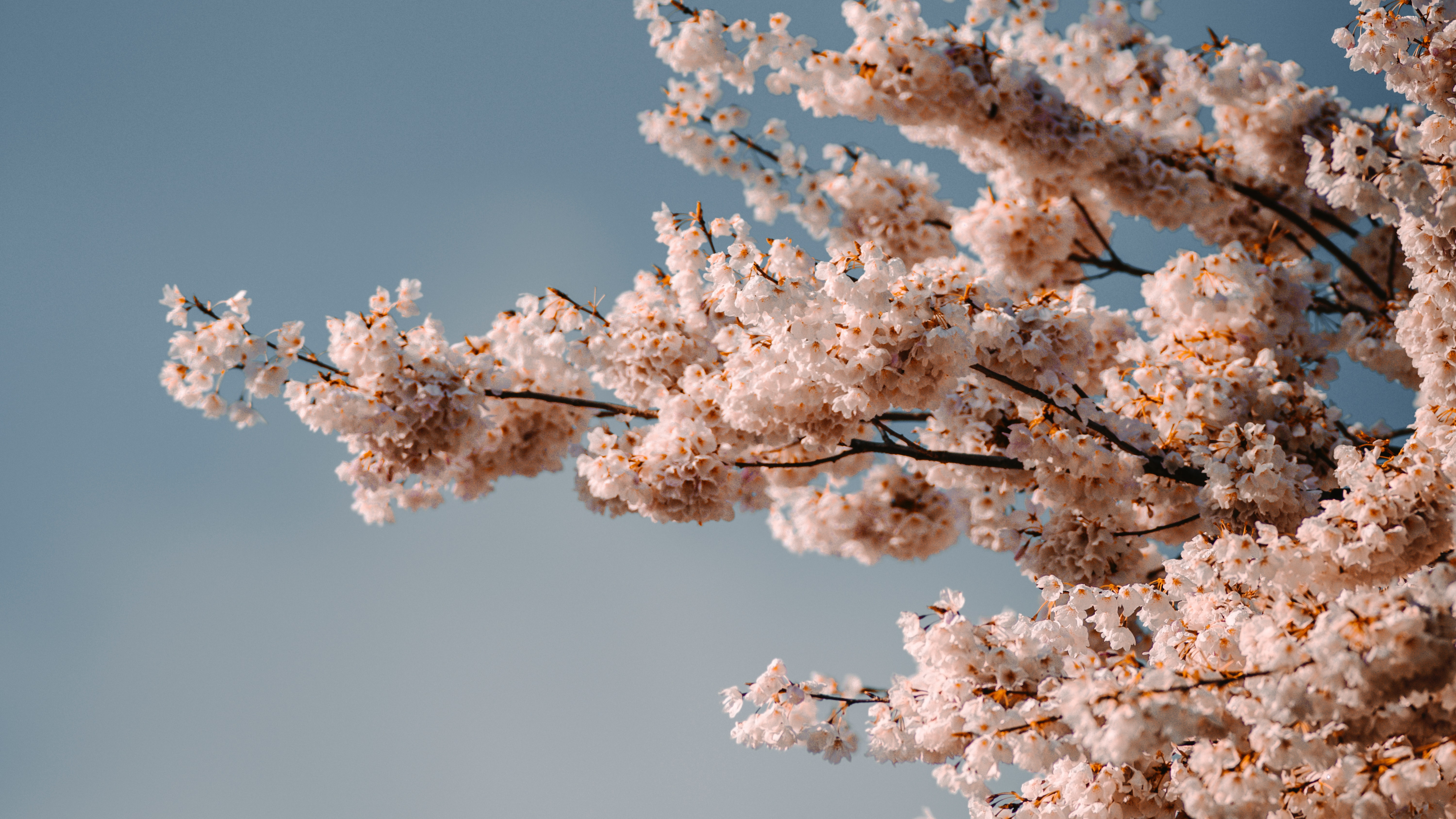 Обои 3840x2160 цветок, цветение вишни, синий, розовый, белые, 4K Ultra HD картинка