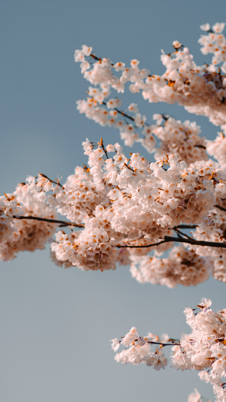Обои цветок, цветение вишни, синий, розовый, белые для iPhone 6, 6S, 7, 8, заставка, 750x1334 картинка