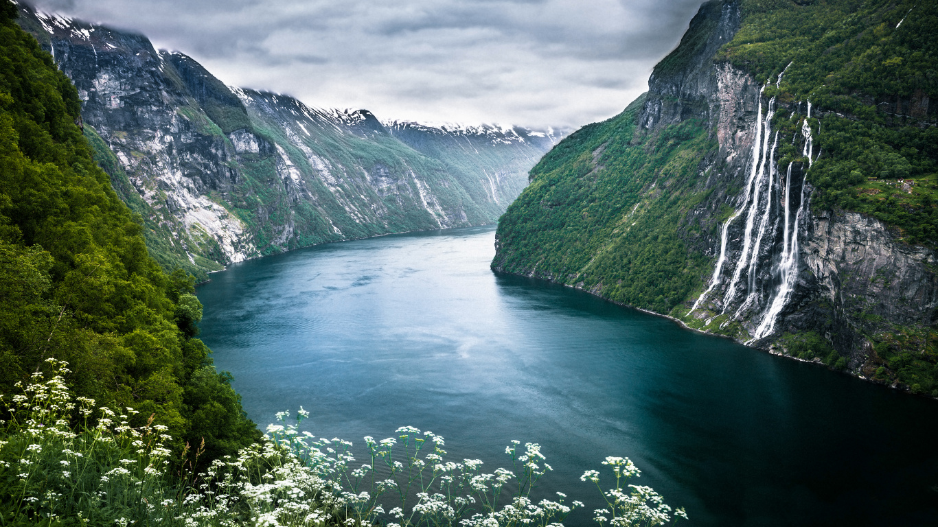 Обои 1366x768 водопад семи сестер, гейрангер, Skagefl, фьорд, солнцемре, HD ready картинка